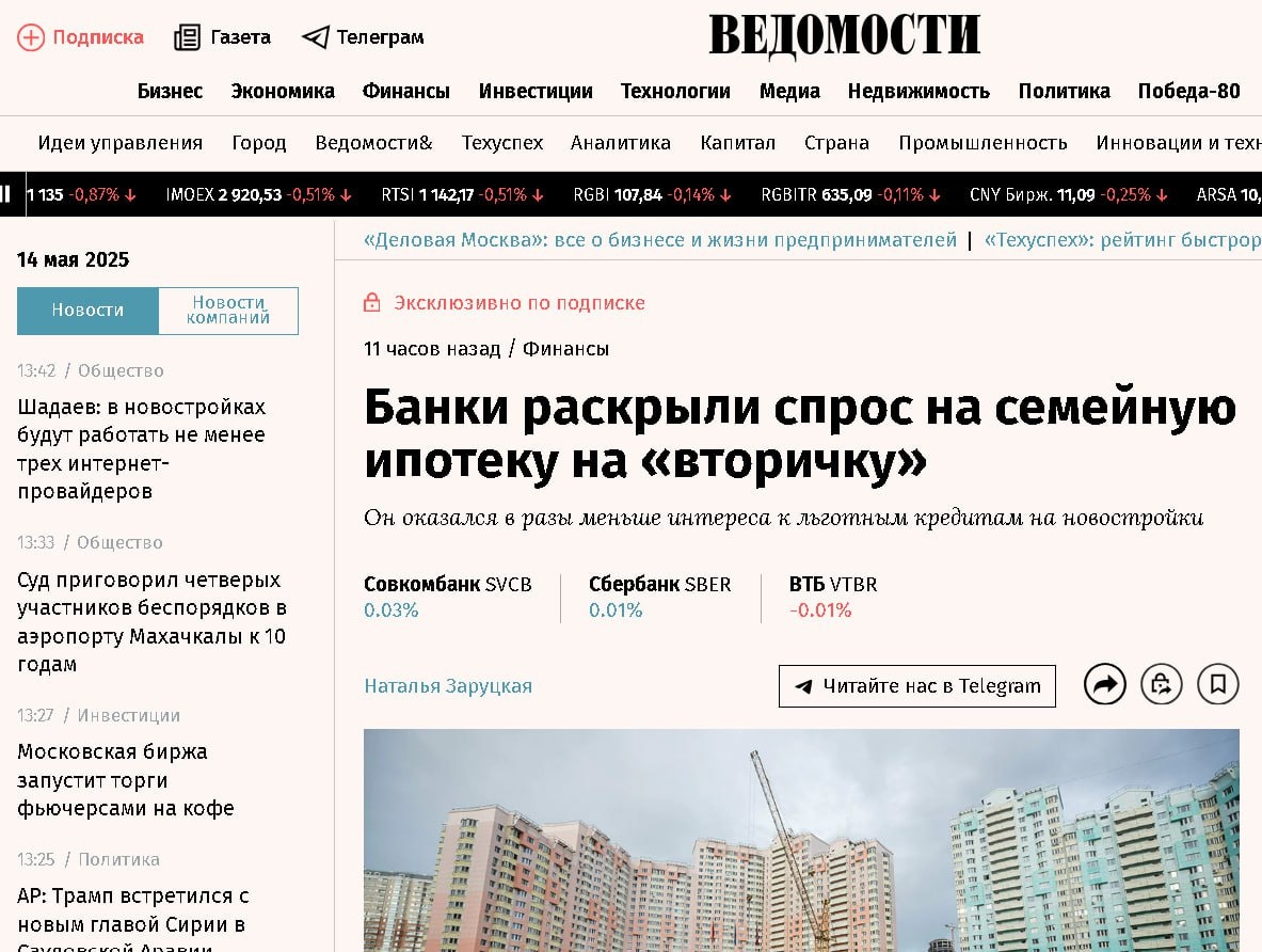 Нас услышали. Только вчера в чате вспоминали ипотеку на вторичку, что-то не слышно, что с ней? Сегодня Ведомости привели цифры по двум банкам: Сберу и ВТБ. Первый начал выдавать с 1 апреля, второй с 28 марта. За всё время по состоянию на 12 мая «зелёный банк» выдал кредитов на вторичку на 4,4 млрд., второй на 2,8 млрд.руб. На двоих 7,2 млрд. Но ТОЛЬКО лишь за апрель на новостройки выдано льготных кредитов на 147,6 млрд., плюс майские показатели, которые не приводятся. На вторичку приходится 1/30, где-то так. Не говорят, потому что сказать нечего. А шуму-то было, пафоса... 😆 📱Зде 📱Зде info 📱Ззз