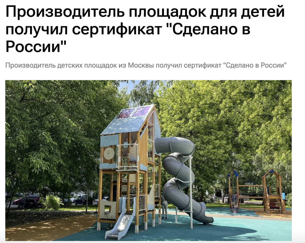 Производитель площадок для детей получил сертификат "Сделано в России"