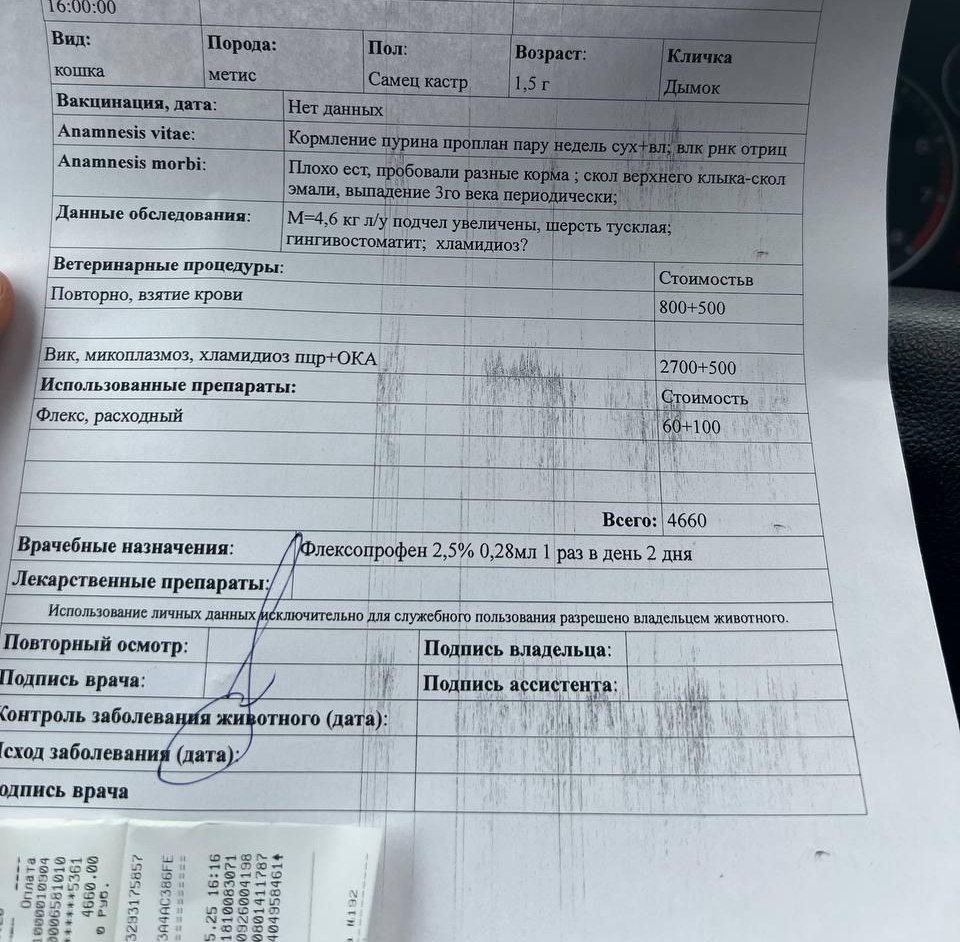 Дорогие друзья! Напомню, что у нас на передержке в Мытищах живёт кошечка Стеша. Лето уже близко, и для профилактики мы решили проверить её здоровье. 💉 Состояние Стеши - Сдали кровь (выездной забор хорошего профессионального врача + анализ = 3700 руб.). - По внешнему виду всё в норме, но есть лишний вес* (малоподвижность + неконтролируемый доступ к еде). - Десна не бледные, но для полной картины нужно: - УЗИ брюшной полости (в «С-вет делают,запись на сегодня). - потом обязательно еще раз Анализы на вирусы (исключить хронические инфекции). - Проверить гемоконцентрацию (возможно, мало пьёт воды) Хорошие новости: Стеша с аппетитом ест влажный корм «Феликс» и даже суп! 🐱 Дымок: внезапные проблемы. Хозяйка передержки отвезла его к врачу (анализы и приём оплатили пополам 🙏 с ней - Симптомы: воспаление, красные десны. - Сделали: - Анализ крови-пришли отличные результаты 👍 - Мазки с глаз. - Тесты на инфекции (но микоплазмоз и иммунодефицит пока не проверяли). - Лечение: обезболивающее +