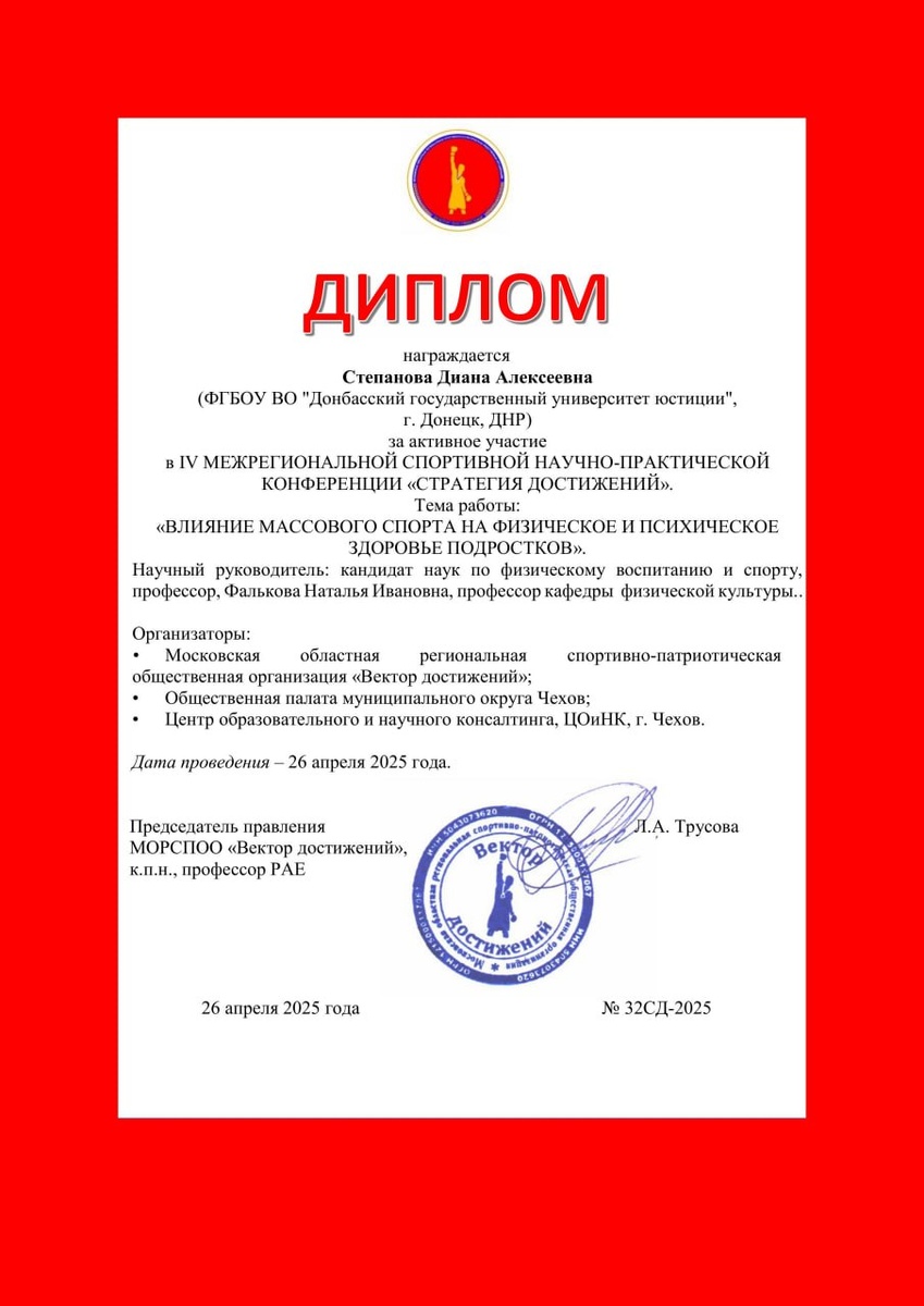 ⚡️ 26 апреля 2025 года в г. Чехов (Московской обл.) прошла IV Межрегиональная спортивная научно-практическая конференция «Стратегия достижений». ✔️ Организаторами Конференции являлись: ➖Московская областная региональная спортивно-патриотическая общественная организация «Вектор достижений»; ➖Общественная палата городского округа Чехов; ➖Центр образовательного и научного консалтинга, ЦОиНК го. Чехов. 📣 Конференция проводилась с целью развития спортивной науки, опережающего научно-технологического и инновационного преобразования спорта, спортивной подготовки, создания условий, способствующих росту интеллектуального и творческого потенциала обучающихся и студентов, тренеров и педагогов, в том числе в области физической культуры и спорта. ⭐️ Задачами конференции являлось: популяризация и развитие здорового образа жизни, спорта и научного подхода к ним среди молодежи; выявление представителей молодежи, интересующихся научно-исследовательской и проектной деятельностью, содействование проф