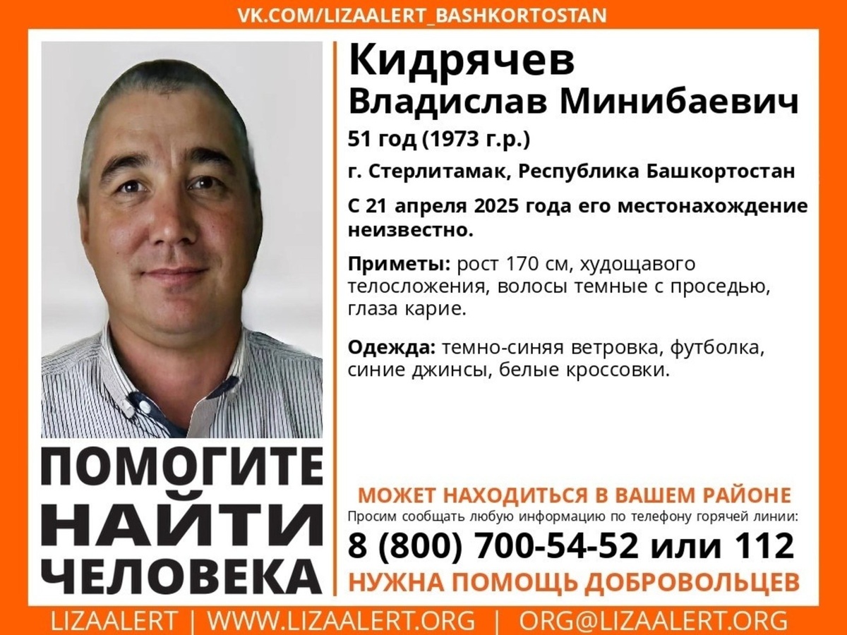 51-летний Владислав Кидрячев из Стерлитамака пропал без вести в Башкирии 21 апреля. Всех, кто располагает какой-либо информацией, просят сообщить по телефонам 8-800-700-54-52 или 112. По информации поискового отряда "Лиза Алерт РБ".