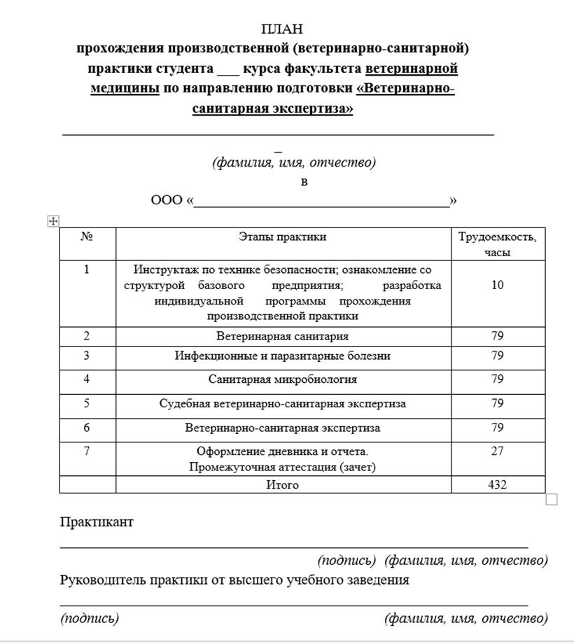 студента _______группы _____ курса по направлению подготовки Ветеринарно-санитарная экспертиза факультета ветеринарной медицины Ф.И.О. студента в родительном падеже в хозяйстве (предприятии) _________________________________________ С «____» _________ 202__г по «___» __________ 20__ г СОДЕРЖАНИЕ План прохождения производственной (ветеринарно-санитарной) практики …4 Индивидуальное задание по производственной (ветеринарно-санитарной) практике …………………………………………………………………………..5 ДНЕВНИК о прохождении производственной (технологической, ветеринарно-санитарной) практики ……………………………………………………………7 Сводка о работе, выполненной на производственной (технологической, ветеринарно-санитарной) практике …………………………………………… Заключение по дневнику ……………………………………………………….. ОТЧЕТ о прохождении производственной практики ………………………… ВВЕДЕНИЕ ………………………………………………………………………. 1. Работа ветеринарного врача ………………………………………………….. 1.1 Ветеринарно-санитарная экспертиза ……………………………