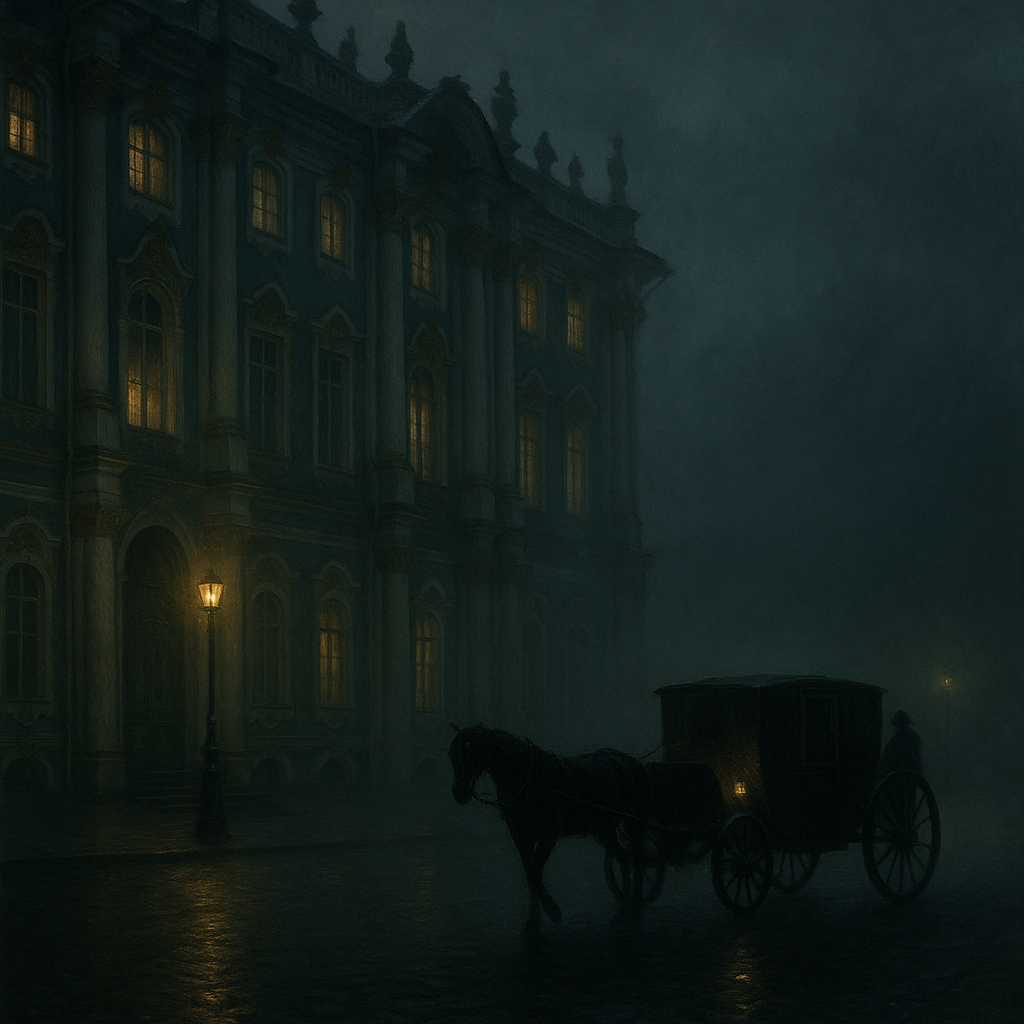 Ночь над Петербургом опустилась тихо, как тень от свечи. В Зимнем дворце всё замирало — хрусталь перестал звенеть, слуги рассыпались по тёмным коридорам, и лишь сквозняки, проникающие в щели между мрамором и шёлком, тихо жаловались на что-то своё. Где-то за окнами, в туманной глубине набережной Мойки, старая карета с глухо хлопающей обивкой подкатала к чёрному входу. Не было крика кучера, не топали копыта. Всё случилось беззвучно, как в сказке — или как в дурном сне.