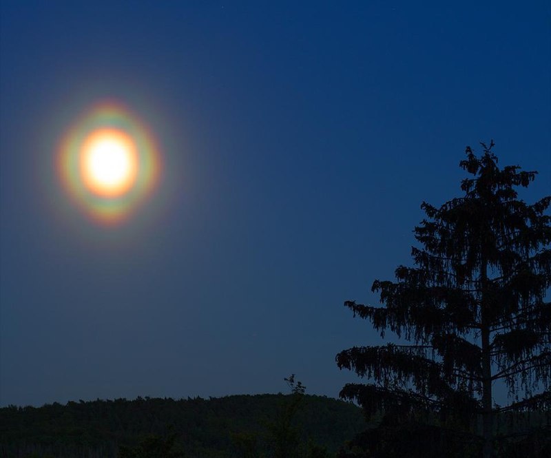 🌲 Это явление возникает, когда свет рассеивается на зёрнах пыльцы. Например, лунный венец на фото вызвало обилие сосновой пыльцы в атмосфере. В отличие от венцов, вызванных каплями воды, пыльцевые обычно ярче и часто не круглые, а овальные.