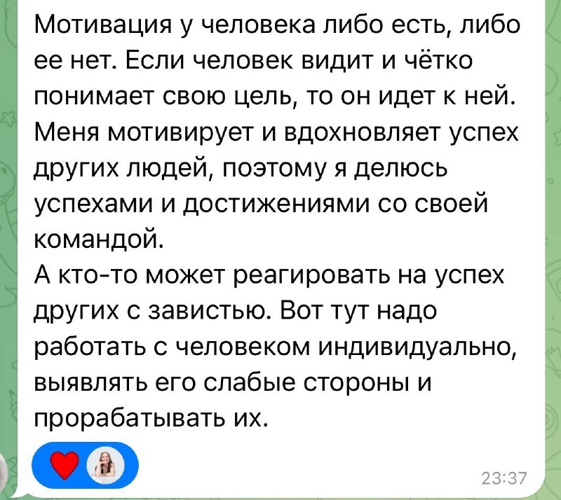 Давайте сегодня продолжим про мотивацию… Я абсолютно согласна с вот этим комментарием👆 И поэтому, когда мне задают Вопрос "как мотивировать людей?" , я честно отвечаю: - Никак. Потому что, мотив - это внутренняя побуждающая сила человека. Это то, что движет лично им. У всех нас разный набор личных мотиваторов, который зависит от разных факторов: типа личности, воспитания, самообучения, текущих обстоятельств. Причём, в разные периоды, разные мотиваторы по разному нами приоритезируются и определяют наше поведение. Нельзя заставить человека хотеть. Вместе с этим не все так печально и безысходно. Что может сделать руководитель? Может: 1️⃣узнать мотивы сотрудника, например, при подборе и взять в команду с нужной мотивацией. 2️⃣быть внимательным при работе и видеть, какая мотивация сейчас преобладает 3️⃣показывать сотруднику, как эти мотивы он может удовлетворить в команде и компании. - это невозможно, для этого нужен талант художника- скажете вы.. - мастерство- отвечу я- этому м