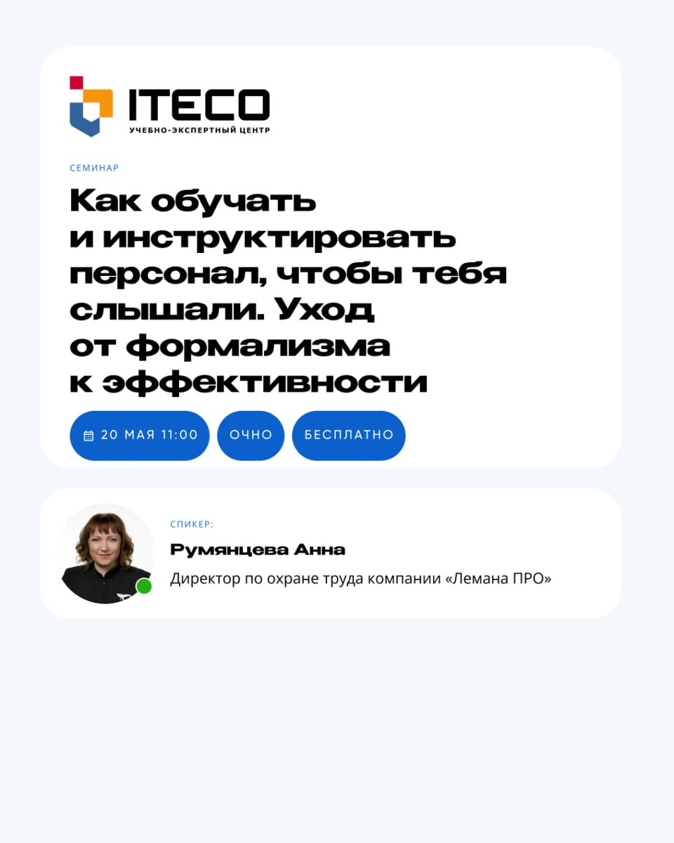 #Семинары ⚡️ Коллеги, недавно мы проводили опрос, в котором предложили вам выбрать тему следующего семинара. Больше всего ваших голосов набрала тема: «Как обучать и инструктировать персонал, чтобы тебя слышали. Уход от формализма к эффективности». Спасибо за вашу активность, сказано — сделано, семинару быть! 🗓 Старт: 20 мая в 11:00 📢 Формат: очно, без онлайн трансляции 💳 Стоимость: бесплатно 📍 Адрес: Московская область, г. Подольск, ул. Комсомольская, д. 28, стр. 2, 5 этаж, офис № 504, 506, 507, 508 (БЦ «Пассаж») Спикер: ⭐️ Румянцева Анна — директор по охране труда компании «Лемана ПРО». Программа 📋 Мероприятие будет интересно специалистам, работающим в сфере ритейла, а также всем, кто стремиться создать эффективную систему охраны труда в компании. 🔗 Записаться