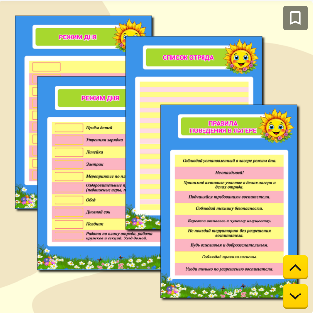 Данная разработка пригодится для эстетичного оформления уголка отряда пришкольного или загородного лагеря. Она включает в себя: 1. Правила поведения в лагере 2. Список отряда. 3-4. Режим дня (в двух вариантах). Если для вашего расписания не подойдет предложенный вариант, то либо впишите свой вариант в пустой бланк. 5. Наши дни рождения 6. Поздравляем с днём рождения! 7. Наш девиз 8. Наши законы 9. Объявления 10. Информация для родителей Уголок отряда скачать здесь Также вам могут пригодиться: 1. "Уголок безопасности", разработанный в похожем стиле, скачать здесь 2. Наградные бланки скачать здесь