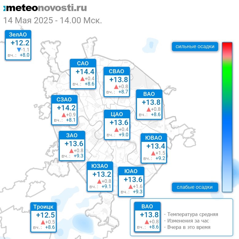 В 14:00 в Москве было от +11.7°C до +15.2°C, средняя температура +13.6°C #погода #Москва #весна #температура #14мая #среда