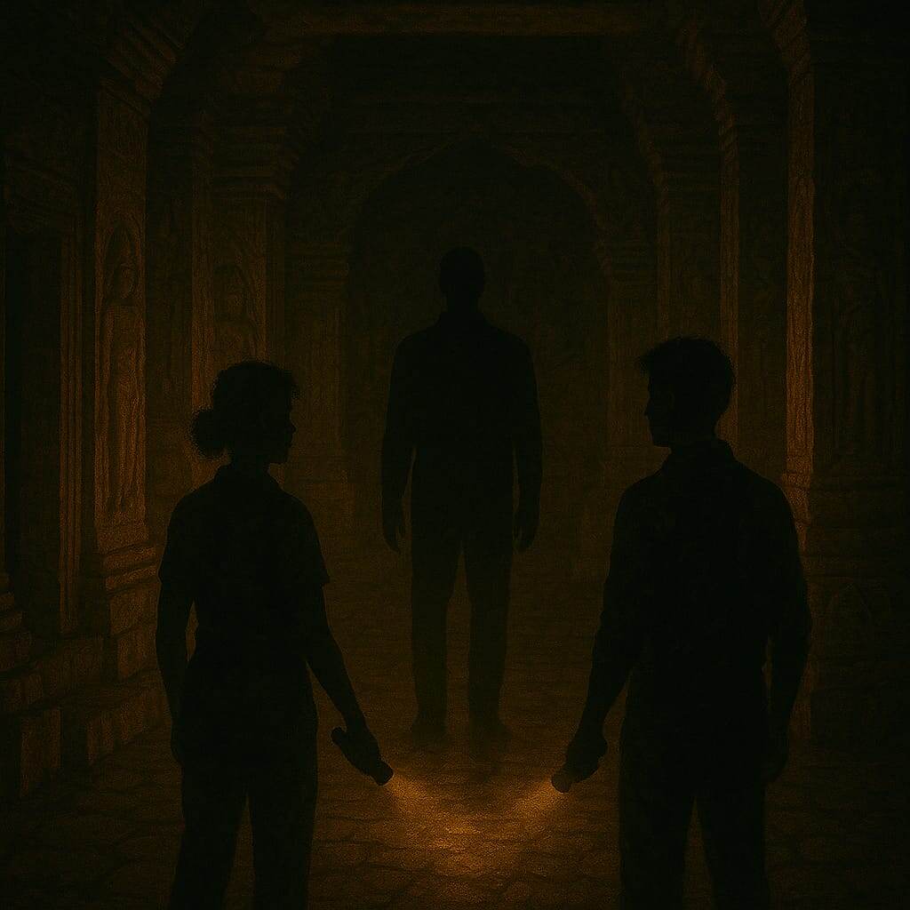 Незнакомец уверенно повёл Анну и Сергея вглубь храма Тхомманон. Узкие проходы, покрытые барельефами, отбрасывали причудливые тени, а массивные колонны создавали ощущение древнего лабиринта. Каменные своды давили, пропуская лишь слабый свет их фонарей.