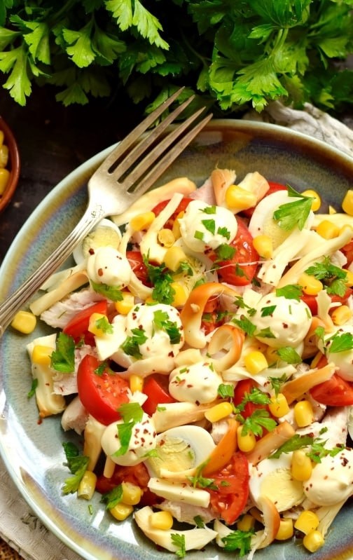 Нестандартное, но очень вкусное сочетание! Копчёный сыр, нежное мясо, свежие овощи — попробуй обязательно 💛 🛒 Ингредиенты: 🧀 Сыр косичка (копчёный) — 200 г 🍗 Куриная грудка — 150 г 🥚 Перепелиные яйца — 4 шт. 🍅 Помидоры — 3 шт. 🌽 Кукуруза консервированная — 30 г 🧄 Чеснок — 1 зубчик 🥄 Майонез — 2 ст. л. 🌿 Петрушка — 10 г 🧂 Соль, перец — по вкусу 👩🍳 Приготовление: Сыр нарежь поперёк, раздели на тонкие полоски. Куриное филе отвари в подсоленной воде (15 мин после закипания), остуди, нарежь крупными кубиками. Яйца отвари (3 мин), остуди, очисти и разрежь пополам. Помидоры нарежь крупными сегментами, сок слей. Выложи на тарелку курицу, яйца, помидоры, затем добавь сыр и кукурузу. Смешай майонез с чесноком, заправь салат. Посоли, поперчи, укрась зеленью и перемешай перед подачей ✨ Готово! Сытный, ароматный и в меру пикантный салат на каждый день или для гостей 👌