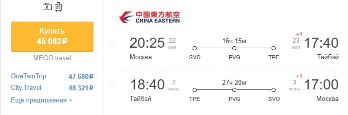 ✈️Москва - Тайбэй (Тайвань), пересадка в Шанхае, туда и обратно, с багажом за 45100 рублей 22 мая - 2 июня - https://checkintime.ru/pzva 🏖 Поиск туров | ✈️Авиабилеты
