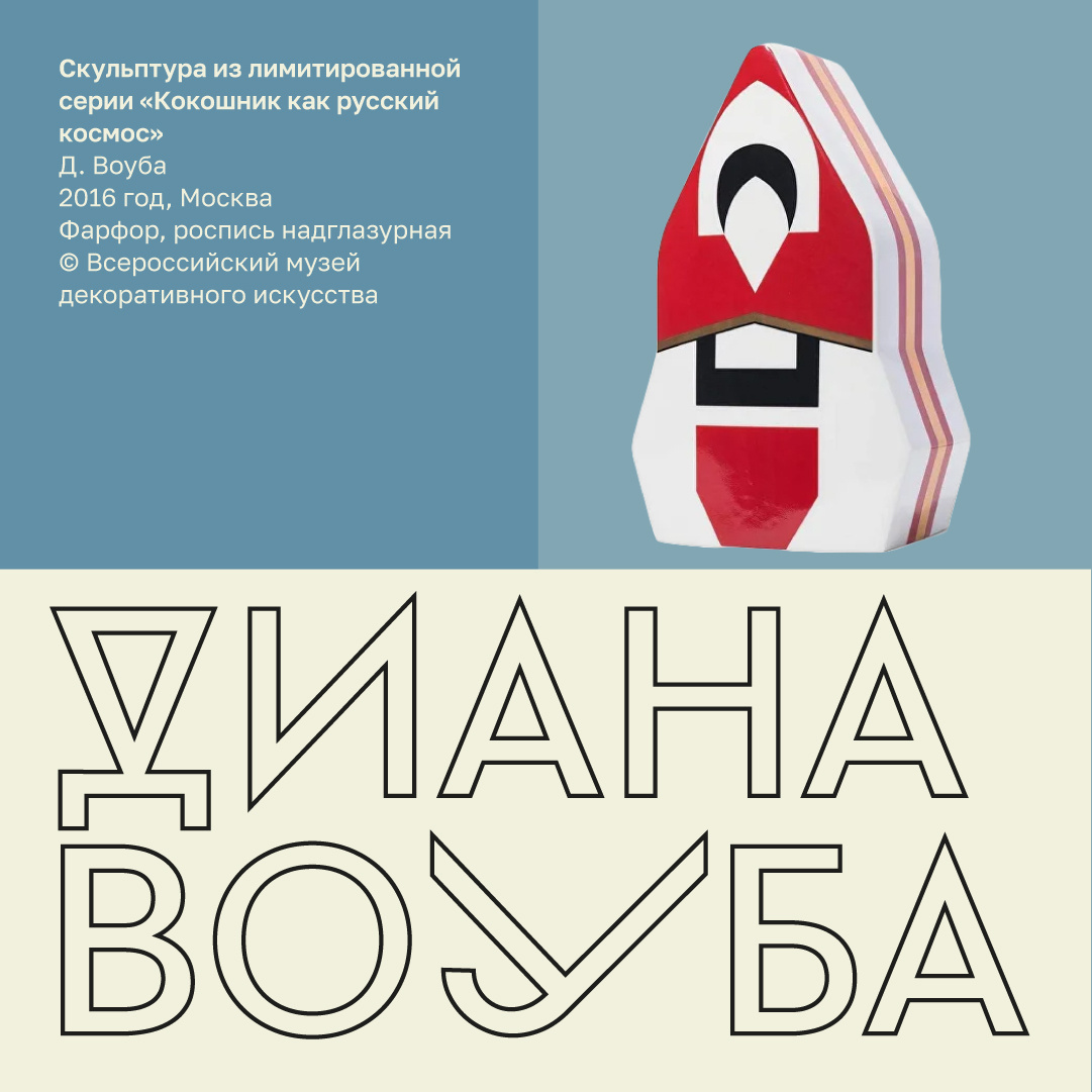 В современном предметном дизайне «русский стиль» занимает центральное место, объединяя многообразные традиции, обычаи, эстетические идеалы с новыми технологиями и концепциями. Художник Диана Воуба уже несколько лет размышляет в своем творчестве о традиционном русском образе, создавая новый предметный мир России. Недавно коллекция нашего музея пополнилась серией скульптур из проекта художницы «Алфавитяне», а на постоянной экспозиции «Вещь! Ре/Конструкция» вы можете увидеть экспонат из лимитированной серии Дианы Воуба «Кокошник как русский космос», который представляет синтез сразу нескольких характеристик русского стиля. Традиционный образ матрешки с кокошником «сконструирован» из геометрических фигур, а в качестве цветовой гаммы автор использовала красный, черный и белый цвета - характерную палитру авангарда. Лаконичное и плоскостное решение скульптуры позволяет вписать ее в силуэт ракеты, отсылая к теме космоса - еще одного «кода» современного русского стиля. Многослойная образность с