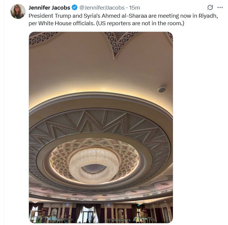 Tramp Saudiya Arabistonida Suriya prezidenti Ahmad ash-Shara’a bilan uchrashuv o‘tkazdi — WP Bloomberg jurnalisti ham siyosatchilar muzokara olib borayotganini ma’lum qildi. Bu ikki davlat rahbarlarining so‘nggi 25 yildagi birinchi uchrashuvi hisoblanadi. @daryolive
