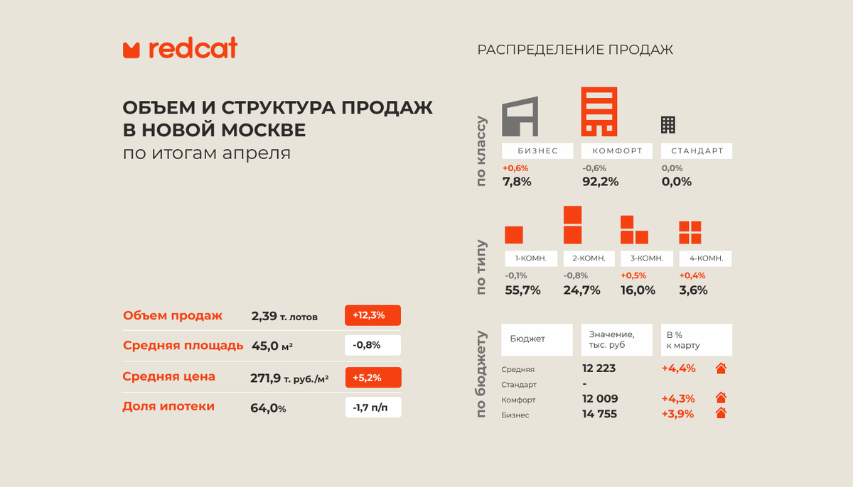 В Новой Москве в отличие от других локаций, в апреле спрос развернулся в сторону роста, при этом динамика прироста была такой активной, что количество проданных квартир превысило уровни активного февраля. По итогам месяца в Новой Москве было продано 2,39 тыс. квартир и апартаментов, что на 12,3% больше, чем в марте. Если сравнивать текущие показатели с прошлым годом, то апрель этого показал результаты на 1,2% выше, в апреле 2024 года застройщики реализовали 2,36 тыс. лотов. В течение месяца спрос рос во всех сегментах, но более активный прирост отмечался в новостройках бизнес-класса, дорогие новостройки прибавили 21,6% по количеству сделок, а более доступные – 11,6%. Так 92,2% (-0,6 п/п) всех сделок в Новой Москве приходится на новостройки комфорт-класса, доля бизнес-сегмента, поднялась на 0,6 п/п до 7,8%, продаж новостроек стандартного класса в апреле зафиксировано не было. Что касается структуры по количеству комнат, то наиболее активно спрос рос в сегменте трех и четырехкомнатных ло