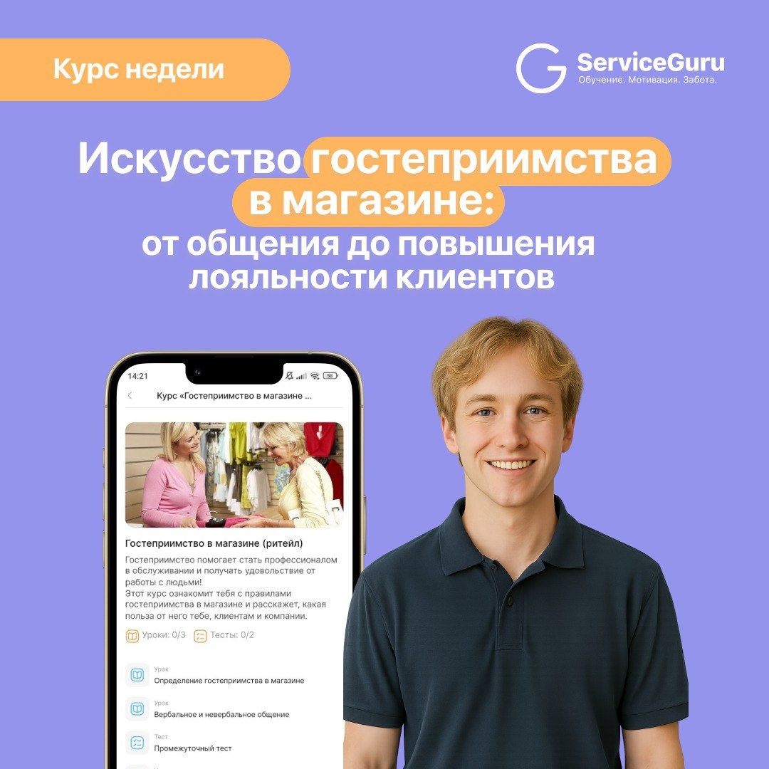 Курс недели: Искусство гостеприимства в магазине — от общения до повышения лояльности клиентов 🥰 Бывает, что покупатель заходит с хмурым лицом, а выходит — с благодарностью. И дело тут не только в скидках. Гостеприимство — это не дежурная улыбка и «здравствуйте». Это умение быть внимательным, улавливать настроение и помогать 😌 В курсе раскрываем темы: ✅ Что такое гостеприимство и как оно работает в ритейле ✅ Как ненавязчиво и с пользой общаться с покупателями ✅ Что даёт гостеприимство (не только клиенту, но и вам, вашим сотрудникам и бизнесу) 📎 Подробнее о курсе здесь 📖 Готовые курсы по сервису от экспертов для всех должностей: смотреть тут #курс_недели