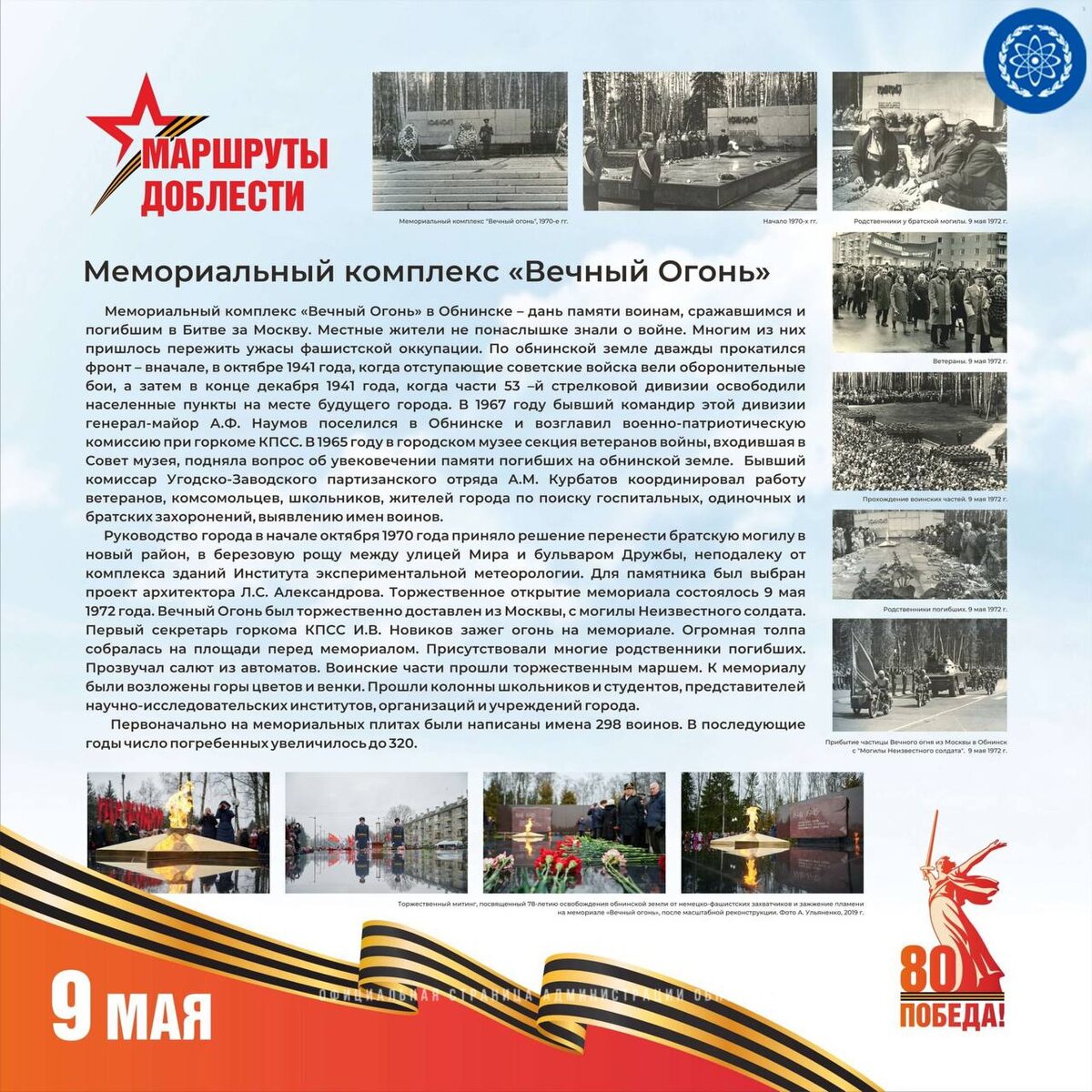 В этом году сотрудники Музея истории города дополнили выставку новыми материалами. Экспозиция состоит из двух частей: «Имена Героев на улицах города» рассказывает о выдающихся участниках Великой Отечественной войны, которые жили в Обнинске, «Маршрут доблести» посвящён знаковым местам и памятникам, связанным с событиями военных лет.