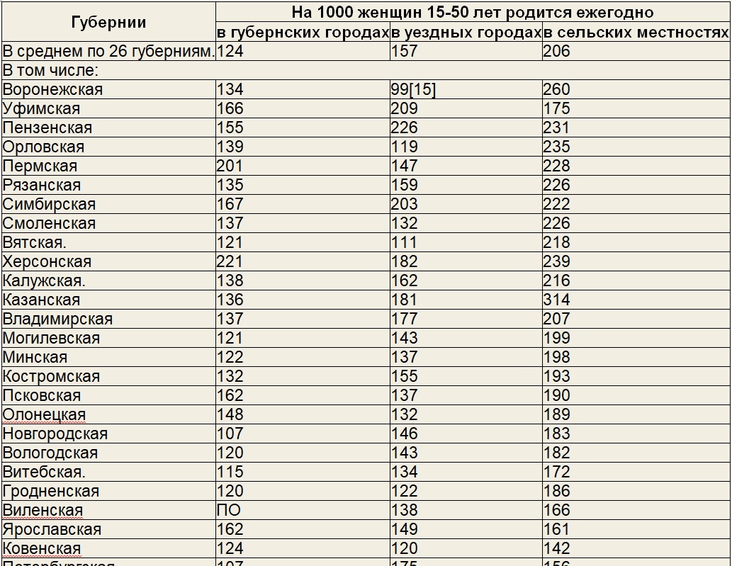 Рождаемость 1896-1897, Рашин: https://istmat.org/node/80 Умножим на 30: за 30 лет 1000 женщин сельской местности родят 6 000 детей, В уездных городах – 4 500 детей, В губернских городах – 3 750 детей. ----- Значит, на селе это 6 детей на женщину, В уездном городе – 4,5, В губернском – 3,75. До взрослости тогда доживала едва ли половина рожденных, и в городе, и на селе, «О чем говорит и о чем не говорит нетто-коэффициент воспроизводства населения» https://www.demoscope.ru/weekly/2003/0125/tema01.php значит, Воспроизводство было: на селе - 3 ребенка на женщину, в уездных городах – 2,25, в губернских – 1,85 – Урбанизация, урбанизация! И образование женщин. Вот она, причина вымирания? Ха. Урбанизации и образованию тогда сопутствовали пенсии. Да, да, те же самые пенсии – «Старость за счет ЧУЖИХ детей» «Впоследствии пенсионная система в России неуклонно расширялась, включив в себя обширные категории людей, которых сегодня называют бюджетниками. Право на пенсии получили низшие служащие, не и