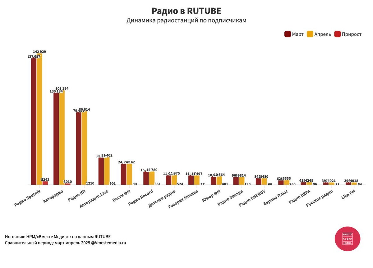 Радио в RUTUBE. Динамика радиостанций по подписчикам (Март-апрель 2025) Отмечается очень вялая динамика прироста подписчиков у всех радиоканалов. ➡️ Радио Sputnik — абсолютный лидер по числу и приросту подписчиков ➡️ Авторадио обустраивается в категории >100К, набрав в первые весенние месяцы 3010 подписчиков ➡️ В категории >50К подписчиков одна радиостанция — Радио КП В апреле тройка лидеров выглядит так: 1. Радио Sputnik — 142 929 2. Авторадио — 103 194 3. Радио КП — 80 614 ➡️ Лидер рейтинга по подписчикам и по приросту в апреле — канал Радио Sputnik — привлек 📈 + 5 242 подписчиков ➡️ Детское радио (11 975) поднялось в апреле с 8-го на 7 место рейтинга, обойдя канал Говорит Москва (11 497) Топ-5 по приросту подписчиков за апрель: 1. Радио Sputnik 📈+ 5 242 2. Авторадио 📈+ 3 010 3. Радио КП 📈+ 1 210 4. Авторадио.Live 📈+ 901 5. Детское Радио 📈+ 524 Топ-5 по числу подписчиков: 1. Радио Sputnik — 142 929📈+ 5 242 2. Авторадио — 103 194 📈+ 3 010 3. Радио КП — 80 614 📈+ 1 210 4. Авт