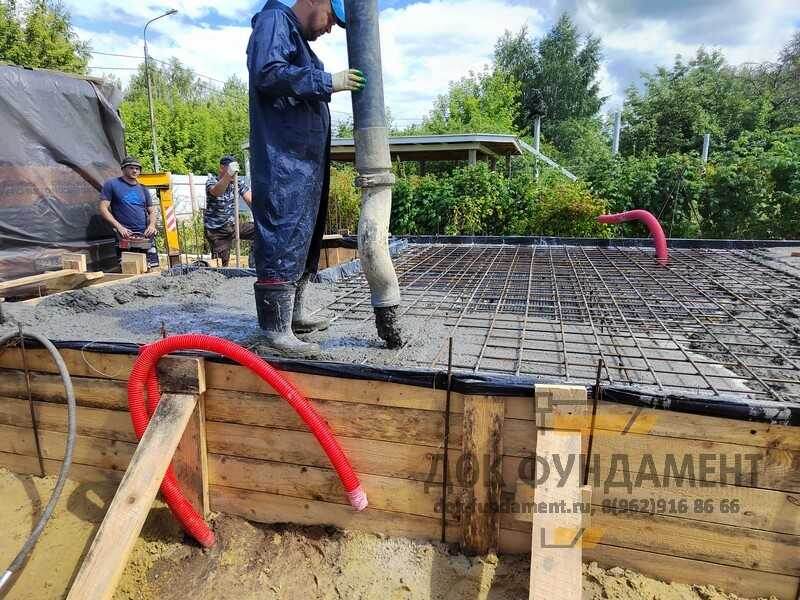 - После установки опалубки вся площадь заливается бетоном и тщательно уплотняется погружным вибратором.