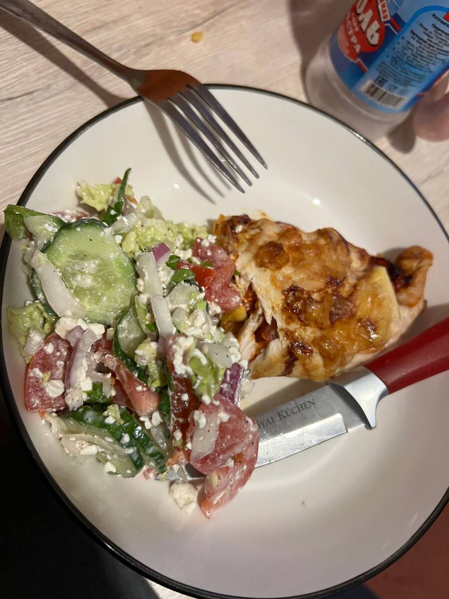 👋 Привет! Подвожу итоги вчерашнего дня 📍 Несмотря на слабость и отёки с утра — день получился в дефиците, сытно и без "жёстких запретов", а главное — с душой и вкусом 💫 🥘 Ужин: Запекла куриную грудку с начинкой: — творог, — немного томатной пасты и горчицы, — тертый сыр, — помидор. Запекала в аэрогриле — получилось нежно и с румяной корочкой. Сверху ещё добавила кусочек сулугуни, который расплавился как в ресторане 😍 🥗 На гарнир — овощной салат: Китайская капуста, огурец, помидор, немного творога и ложка сметаны 10%. 📊 Итог КБЖУ ужина: ~490 ккал / 47 Б / 27 Ж / 13 У 🚶♀️ Шагов: 5 000 🥄 Итог за день: ~1350 ккал / 102 Б / 78 Ж / 49 У 📉 Вес с учётом отёков — 88.5 🎯 Цель — 83.5 до 30 мая Осталось 17 дней — и я иду к ней уверенно! #рацион1350ккал #ужиннапохудении #марафонкаришки #кбжудень #ппужин #реальныйпуть #минус20кг