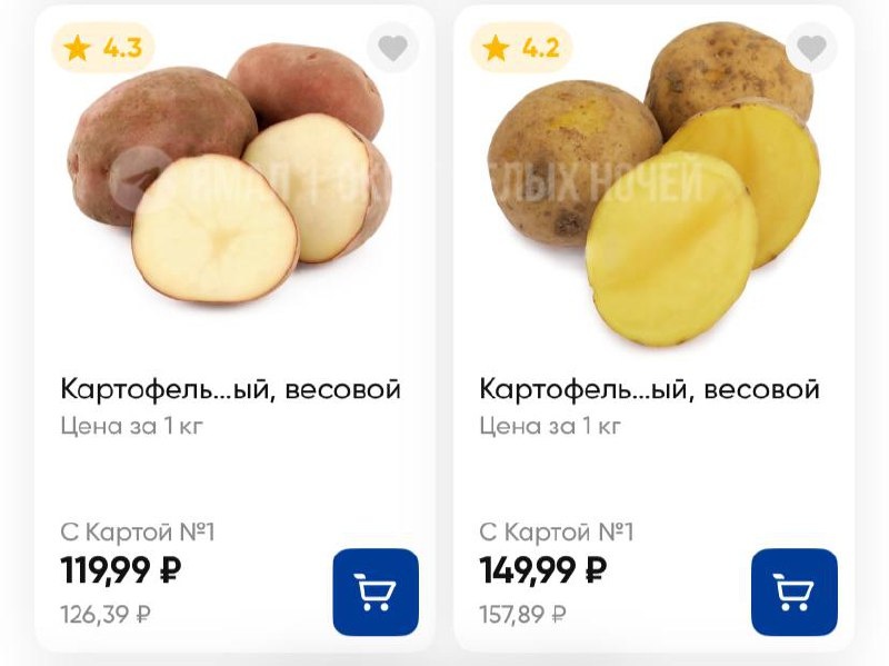 ⚡Цены на картофель взлетели на Ямале Согласно данным «Тюменьстата», за прошедший год стоимость картофеля увеличилась на 125%. В Надыме цена в мае 2025 составила 75₽/кг, в прошлом году — 26₽/кг (рост на 186%). В Ноябрьске в 2024 — 27₽/кг, в нынешнем — 99₽/кг (рост на 257%). Тем временем цены в сетевых магазинах на Ямале сегодня: 🩵«Лента» — цены до 157₽/кг (без карты) 🩵«Магнит» — до 139₽/кг в сетке по 3 кг за 419₽ 🩵«Пятёрочка» — до 109₽/кг в сетке по 3 кг за 329₽ Подписаться | Прислать новость | Дать «буст»