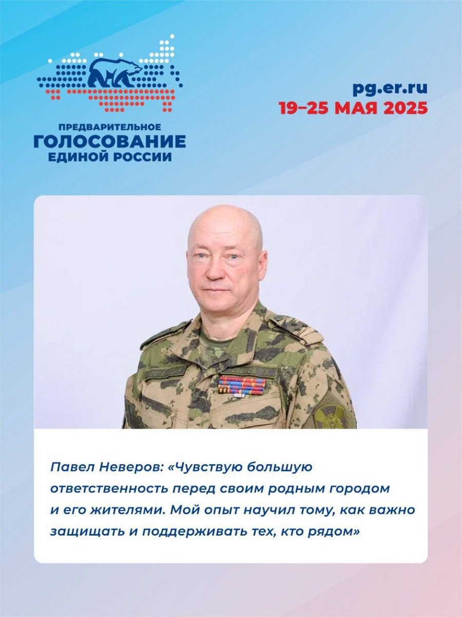 🔹Совсем скоро стартует предварительное голосование «Единой России». Это возможность определить лидеров, которые будут бороться за ваш голос на выборах. Давайте знакомиться с теми, кто пробует свои силы в политике! 🔹Павел Неверов - директор МАУДО "ЦВР" Подросток". Полковник Войск Национальной гвардии в отставке. Участник СВО. 🔹Служил в составе Специального отряда быстрого реагирования, прошел путь от офицера штурмовой группы до командира. Полковник войск Национальной гвардии Российской Федерации в отставке, участник специальной военной операции. Награжден медалями ордена «За заслуги перед Отечеством» I и II степени, «За отличие в охране общественного порядка», «За отличие в воинской службе» II степени. 🔹Сегодня Павел Геннадьевич руководит центром внешкольной работы «Подросток», где занимается патриотическим воспитанием молодёжи. Он по личному опыту знает, как привить ребятам нужные качества и вырастить из них настоящих защитников Родины.