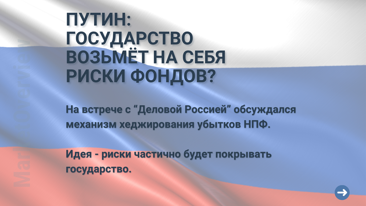 Вчера на встрече с членами “Деловой Россией Президент предложил разработать механизм хеджирования рисков для НПФ и, учитывая присутсвие на встрече Минфина и ЦБ и скорость выполнения настолько прямых поручений, это вполне может реализоваться.