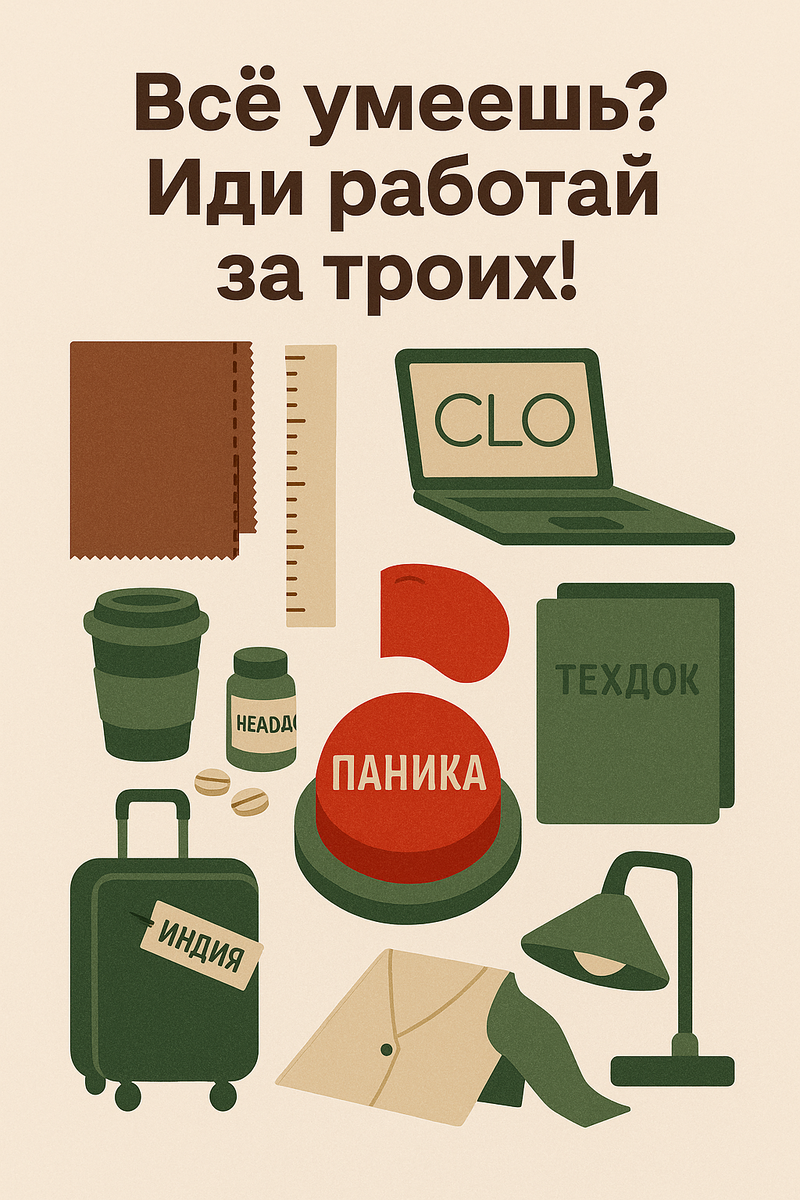 — Срочно требуется конструктор одежды. — Что нужно делать? — Да ничего особенного:⠀ Зарплата — после собеседования (и, возможно, после экзорцизма). ⠀ 📍 Район — не шутка: Бангалор. 📍 Бренд — премиум, ткани — натуральные, сроки — горящие. 📍 Режим — «ты же профессионал, сам разберёшься». Нет, это не мем. Это реально всплыло в профессиональном чате. ⠀ Конструкторы в комментариях: — «Это не работа, это квест: выжить, не выгорев». — «Нужно не знание CLO, а железная нервная система». — «Такое ощущение, что искали женщину-кошку, но без головы — чтоб не думала лишнего». ⠀ И знаете, что самое интересное? Такие вакансии появляются с завидной регулярностью. Значит, где-то ещё жив миф, что хороший конструктор — это: — и швец, — и технолог, — и психотерапевт себе же. ⠀ А теперь серьёзно. Профессия конструктора — это отдельный навык. Он требует фокуса, погружения и уважения к зоне ответственности. И если вы ищете "мастера на все руки", то готовьтесь к тому, что ни одни руки не выдержат такого. Д
