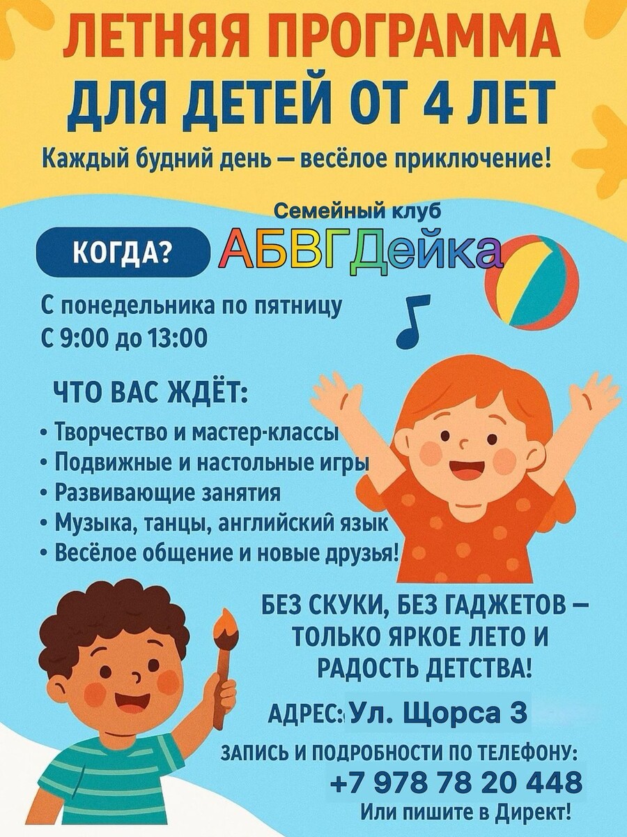 Летний городской лагерь в “Абвгдейке”! С 16 июня открываем двери в наш тёплый, дружный и увлекательный лагерь! Каждая неделя — новая смена, новые занятия, впечатления и друзья! Что вас ждёт: - Творчество и мастер-классы - Игры и спорт - Развивающие занятия - Прогулки и весёлые квесты - Без гаджетов, но с яркими эмоциями! Для детей от 4 лет Пн–Пт, с 9:00 до 13:00 - Стоимость: 600₽ в день (при оплате смены) Адрес: ул. Щорса, 3, г. Керчь Запись: +7 978 782 04 48 https://vk.com/abcd_club Мест мало — спешите записаться! Подарите ребёнку яркое и весёлое лето в “Абвгдейке”! Реклама. Индивидуальный предприниматель Селезнева Татьяна Витальевна. erid: 2SDnjdedry3.