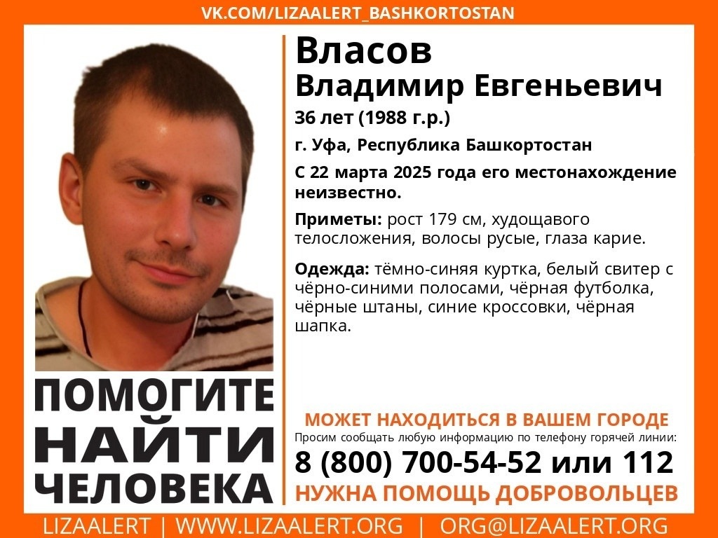 Уфимец Владимир Власов пропал без вести в Башкирии с 22 марта, информирует «Лиза Алерт РБ». По данным волонтеров, 36-летний мужчина был одет в темно-синюю куртку, белый свитер с черно-синими полосами, черную футболку, черные штаны, синие кроссовки и черную шапку. Среди других примет жителя — рост 179 см, худощавое телосложение, русые волосы, карие глаза. Всех, кто располагает какой-либо информацией, просят сообщить по телефонам 8-800-700-54-52 или 112. Ранее в республике завершились поиски девушки.