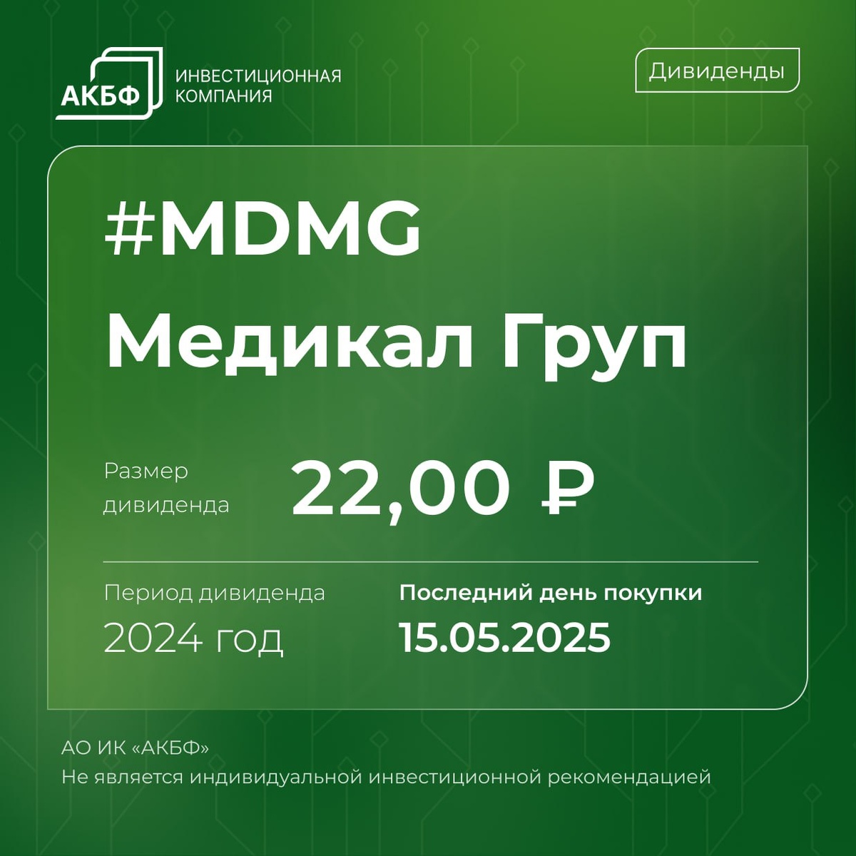 π ΠΠ°Π»Π΅Π½Π΄Π°ΡΡ Π΄ΠΈΠ²ΠΈΠ΄Π΅Π½Π΄ΠΎΠ² 19 ΠΌΠ°Ρ ΠΠ ΠΠ΅Π΄ΠΈΠΊΠ°Π» ΠΡΡΠΏ Π·Π°Π²Π΅ΡΡΠΈΡ ΠΏΡΠΎΡΠ΅ΡΡ Π·Π°ΠΊΡΡΡΠΈΡ ΡΠ΅Π΅ΡΡΡΠ° Π΄Π»Ρ Π½Π°ΡΠΈΡΠ»Π΅Π½ΠΈΡ Π΄ΠΈΠ²ΠΈΠ΄Π΅Π½Π΄ΠΎΠ² Π·Π° 2024 Π³ΠΎΠ΄. Π Π°Π·ΠΌΠ΅Ρ Π΄ΠΈΠ²ΠΈΠ΄Π΅Π½Π΄ΠΎΠ² ΡΠΎΡΡΠ°Π²ΠΈΡ 22,00β½ Π½Π° ΠΎΠ±ΡΠΊΠ½ΠΎΠ²Π΅Π½Π½ΡΡ Π°ΠΊΡΠΈΡ. Π§ΡΠΎΠ±Ρ ΠΏΠΎΠΏΠ°ΡΡΡ Π² ΡΠ΅Π΅ΡΡΡ ΠΈ ΠΏΠΎΠ»ΡΡΠΈΡΡ Π²ΡΠΏΠ»Π°ΡΡ, Π½Π΅ΠΎΠ±Ρ