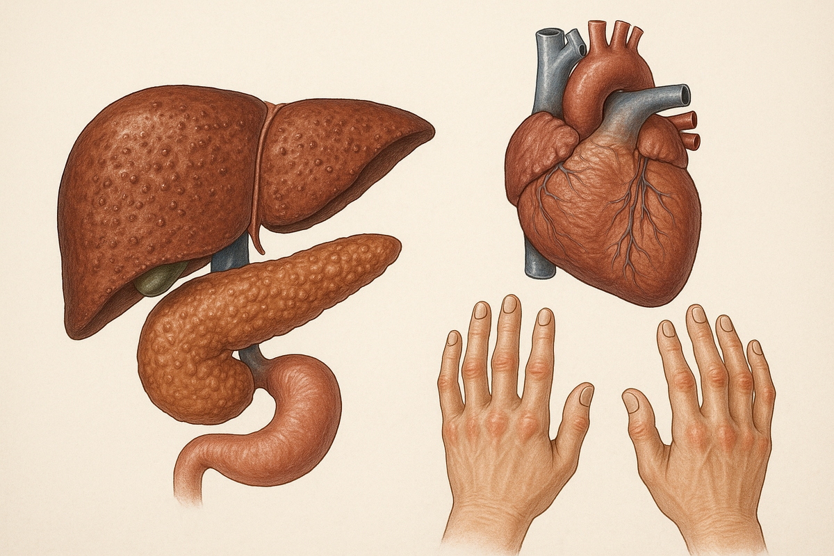 Печень страдает одной из первых. Железо, накапливаясь в гепатоцитах, вызывает их повреждение, воспаление и фиброз. Со временем это может привести к развитию цирроза — одного из самых тяжёлых осложнений. Поджелудочная железа также подвержена повреждению избыточным железом, что может нарушить секрецию инсулина и вызвать сахарный диабет. Сердце может пострадать от дилатационной кардиомиопатии и нарушений сердечного ритма. Суставные боли, особенно в мелких суставах кистей, могут напоминать артрит, что затрудняет диагностику.