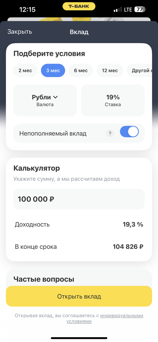 Обратился ко мне клиент с запросом: «Юль, у меня есть деньги и хочу их разместить на вкладе под выгодный %. Найди вариант. Я знаю, ты умеешь это делать». Условия для вклада: Сначала хотели оставить в том же банке, где открыт и накопительный счет под 19 %, но условия для вклада не выгодные: под 17 % на 3 месяца. Нам такой вариант не подходит. Пошла смотреть вклад в Тбанк. На 3 месяца под 19 %. Тоже нам не подходит. Хотим еще больше % ставку. Иду в Сбербанк. Вклад на 3 месяца под 19 % от 100 000 рублей. Следующий вариант: Альфа Банк. Сейчас проходит акция до 31.05.2025 года можно открыть Альфа-вклад «Юбилейный» Такой вклад можно открыть только один. Вклад будет без пополнения и снятия и на данный вклад по максимальной ставке вы можете разместить от 10 000 рублей до 50 000 рублей на 3 месяца. С капитализацией ставка будет: 30,00% годовых Без капитализации: 29,28% годовых Если сумма вклада больше 50 000 рублей, то % ставка будет: с капитализацией - 19,30% годовых без капитализаци
