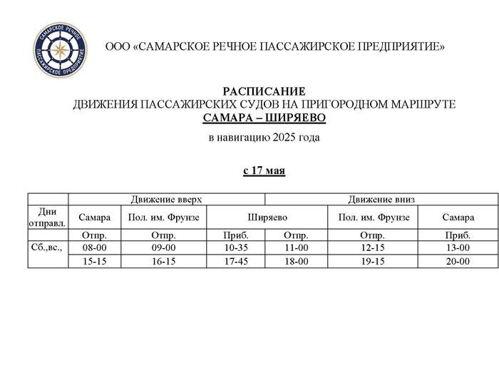 С 17 мая открывается новый речной пригородный маршрут Самара - Ширяево. Суда будут отправляться только в выходные дни. Из Самары в 8:00 и 15:15, обратные рейсы назначены на 12:15 и 19:15.