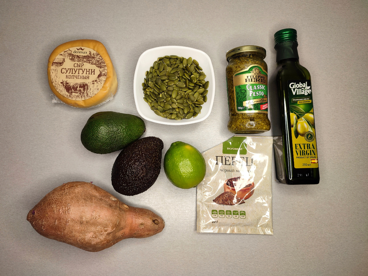 - Батат выложить в салатник, сверху сулугуни с авокадо, тыквенные семечки и песто.