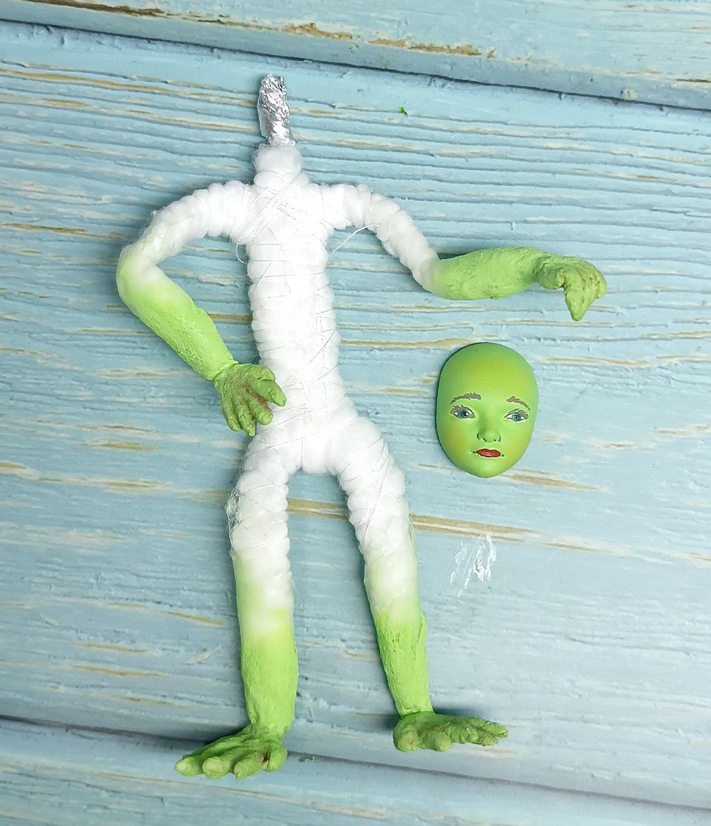 Доброго дня всем! В продолжении рассказа о Кикиморе акцентирую внимание на сборке конечностей в единое тельце. Мы получили кисти рук, стопы ног, раскрасили личико. Остается соединить их вместе. Хитростей здесь нет, процесс обычный, по привычной схеме плетения каркаса и намотки на него ватных слоев. Я не стала снимать подробно эти моменты, поскольку показываю их при изготовлении практически каждой куколки. Но вот ссылка на на видео, где можно посмотреть алгоритм, подходящий для практически всех куколок: А с Кикиморой хочу лишь обратить внимание, что пришлось наложить дополнительный слой ваты на места стыков кистей и руки, стоп и ног. и дополнительно окрасить эти места краской, чтобы вся кожа девочки была одного тона: На этом же этапе придаю игрушке позу, чтобы начать наряжать её в платьице и продолжить украшать: После этих манипуляций заканчивается скучный этап выведения формы и начинается самое интересное - наряд девочки, прическа и украшение мелкими деталями! Об этом расскажу завтра,