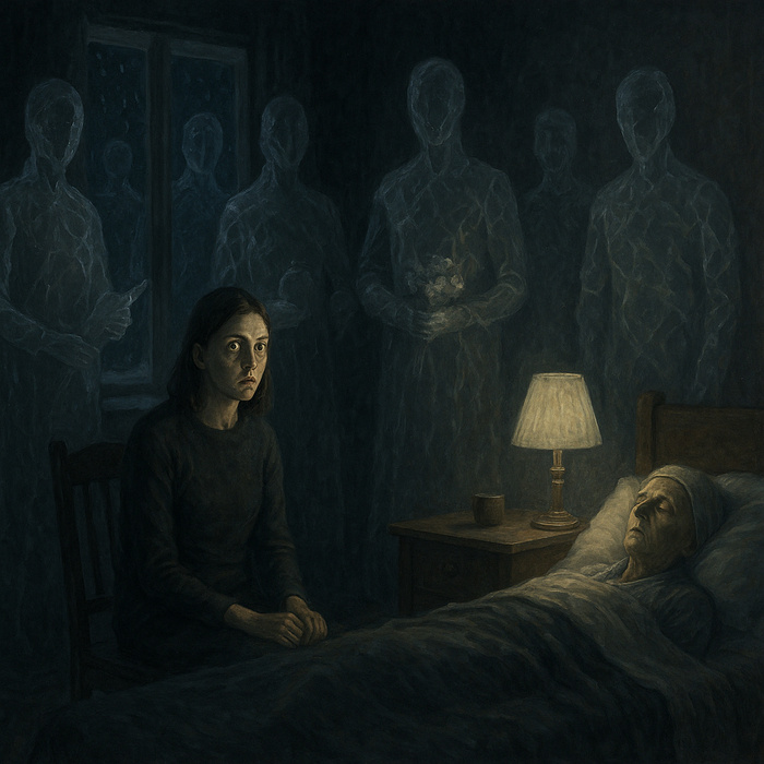 Гости в комнате Эта история произошла со мной несколько лет назад, когда я ухаживала за своей тяжело больной тётей. У неё была онкология. Всё уже было на последней стадии — врачи, хоть и старались подбодрить, но мы, близкие, понимали, что ей осталось недолго. Дочка её тогда лежала на сохранении, муж с утра до позднего вечера на работе, а внуку было всего лет двенадцать. Забота о ней в тот момент выпала на меня — я поехала к ним в Москву, чтобы помочь, быть рядом. Когда ей впервые назначили морфий, я ощутила, что это уже тот самый рубеж, после которого — только уход. Морфий онкобольным дают не сразу, а только в самом конце, чтобы облегчить страдания, когда боли становятся невыносимыми. После первого же укола начались странности. Вечером она вдруг повернулась ко мне и сказала: — Открой дверь, парень к нам пришёл. Я насторожилась. Дверь никто не звонил, да и шагов в подъезде не было слышно. Посмотрела в глазок — никого. На улице темно, только фонарь внизу лениво моргал. Я вернулась и сказала, что никого нет. Она снова тихо повторила: — Он пришёл. Открой ему. Так повторялось два дня подряд. Я спрашивала: — Ты знаешь, кто это? — Нет. Не знаю. Но он к нам идёт. На третий день, устав от этих разговоров, я в какой-то момент всё же открыла дверь. Постояла на пороге, посмотрела по сторонам. Никого. Ни в подъезде, ни на лестничной клетке. Вернулась к тёте: — Видишь? Пусто. Никого нет. С тех пор она больше не упоминала о «парне», и, казалось бы, всё должно было утихнуть. Но всё только начиналось. Мы уже понимали, что конец близок, и родные начали задумываться: где её хоронить? В Москве, где она жила последние годы, или везти на родину? Она была немосквичка, но уже и не совсем чужая городу. Сама тётя уже почти не разговаривала, большую часть времени проводила в каком-то полукоматозном состоянии. Глаза открыты, но взгляд сквозь. Иногда, когда она приходила в себя, я спрашивала, видит ли она сны. Она всегда отвечала: — Нет. Ничего не вижу. Просто темнота. В один из вечеров, когда зять с внуком спали в зале, а мы с тётей были в спальне, я устроилась с книгой рядом с её кроватью. Включила настольную лампу, присела в кресло. Она снова погрузилась в забытьё. Казалось бы — всё как обычно. Я читала, прислушиваясь к её дыханию, и вдруг… Меня охватил леденящий холод. Не просто прохлада — а такой мороз, как будто я оказалась на улице в тридцатиградусный мороз, раздетая. Казалось, даже кровь в венах замерзла. Я не могла пошевелиться. Ни рукой, ни ногой. Только глаза двигались и разум работал чётко, как никогда. Сердце бешено колотилось. Я пыталась позвать зятя, внука, кого угодно, но ни один мускул не слушался. И тогда я поняла — мы не одни в комнате. Вдоль стен, у шкафа, возле двери, даже у подножия кровати стояли… фигуры. Полупрозрачные, похожие на людей, но как будто вырезанные из целлофана. Ростом с человека, очертания головы, рук, ног — всё было, но лиц не видно, пола не определить. У каждого в руках было что-то — как будто предметы, но в этом полумраке и в их прозрачности невозможно было понять, что именно. Цветы? Свёртки? Тени? Они просто стояли. Не двигались. Ни шагов, ни вздохов. И только одна зона в комнате оставалась пустой — та, где сидела я. Как будто они знали, что мне нельзя мешать. Я была в оцепенении. Страх сковал всё моё существо. Это был не просто ужас — это было что-то древнее, животное, когд