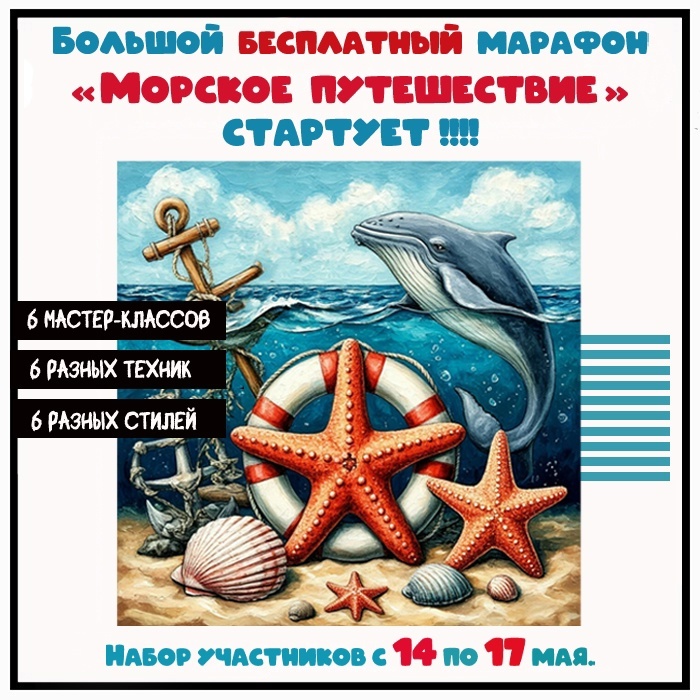 🌊Ура!! Открываем набор участников на большой бесплатный марафон "Морское путешествие"!🌊 Вас ждут 6 эксклюзивных мастер-классов от 6 талантливых мастеров, море новых умений и вдохновения. Набор участников с 14 по 17 мая!!! Подробнее про каждый мастер-класс по тегу: #шторм_морскоепутешествие ⚡⚡⚡Правила участия⚡⚡⚡ ✅Сделать репост этого поста себе на страничку (страничка должна быть открыта) или в творческую группу(в таком случае в комментариях укажите ссылку на группу для проверки репоста). ✅Подписаться на Творческий Шторм и ВСЕХ авторов мастер-классов: Создание уникальных украшений Екатерина Еронина Прикольные игрушки /МК Екатерины Ерониной. Accessories_by_Kate вышивка | кастомизация | МК Творческая мастерская Людмилы Брыль Ватные игрушки Татьяны Низовцевой Студия ювелирного плетения Ирины Михель ✅САМОСТОЯТЕЛЬНО подать заявку в закрытую группу проведения марафона: https://vk.com/club230460803 ✅Написать в комментариях слово "Готово" или любое другое. Доступ ко всем мастер-кла