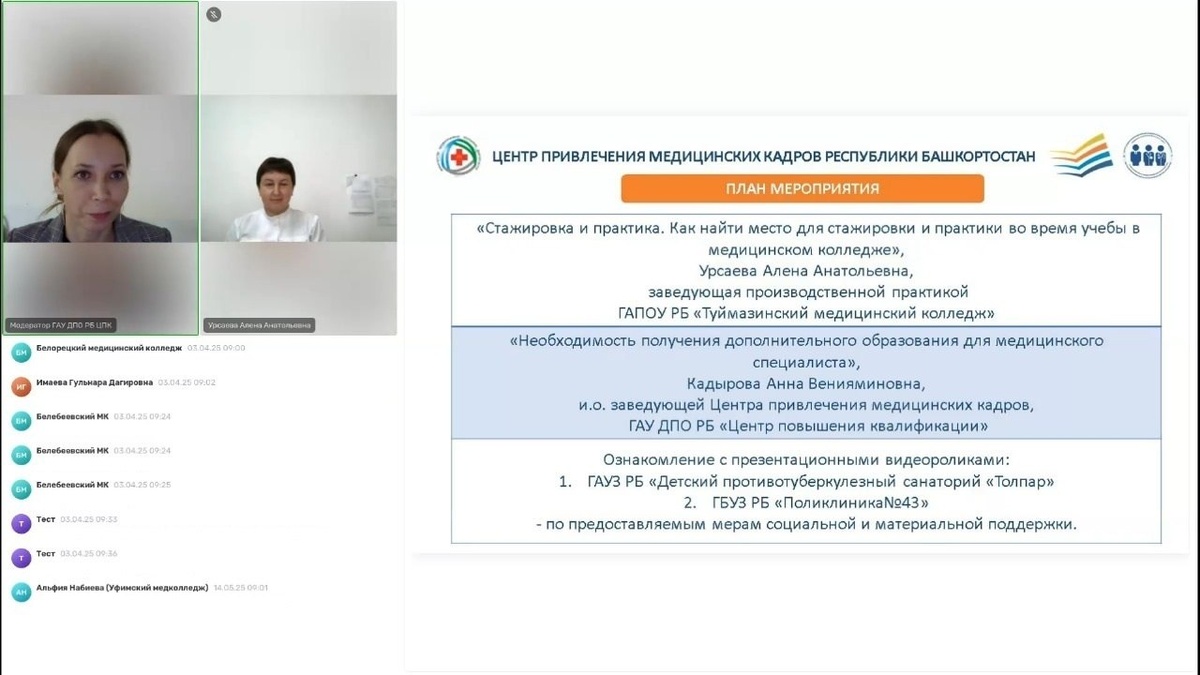 ⚡Сегодня Центр привлечения медицинских кадров Республики Башкортостан провел встречу со 🎓студентами медицинских колледжей, находящихся в ведении регионального Минздрава. 💻Студенты первых курсов по специальности «Лечебное дело», «Акушерское дело», «Сестринское дело», «Фармация» присоединились к мероприятию в онлайн-режиме. ✔️В ходе заключительной в текущем полугодии встречи обучающиеся медколледжей узнали, как найти место для стажировки и практики во время учебы. ✔️Ознакомились с информацией о необходимости получения доп.образования для медицинского специалиста. ✔️А также просмотрели презентационные видеоролики по предоставляемым мерам социальной и материальной поддержки Детского противотуберкулёзного санатория «Толпар» и Поликлиники №43. ☝️Напомним, что с появлением Центра привлечения медицинских кадров в нашей республике, подобные встречи со студентами проводятся на регулярной основе. Они играют важную роль и направлены на привлечение и удержание медицинских кадров в мед.органи