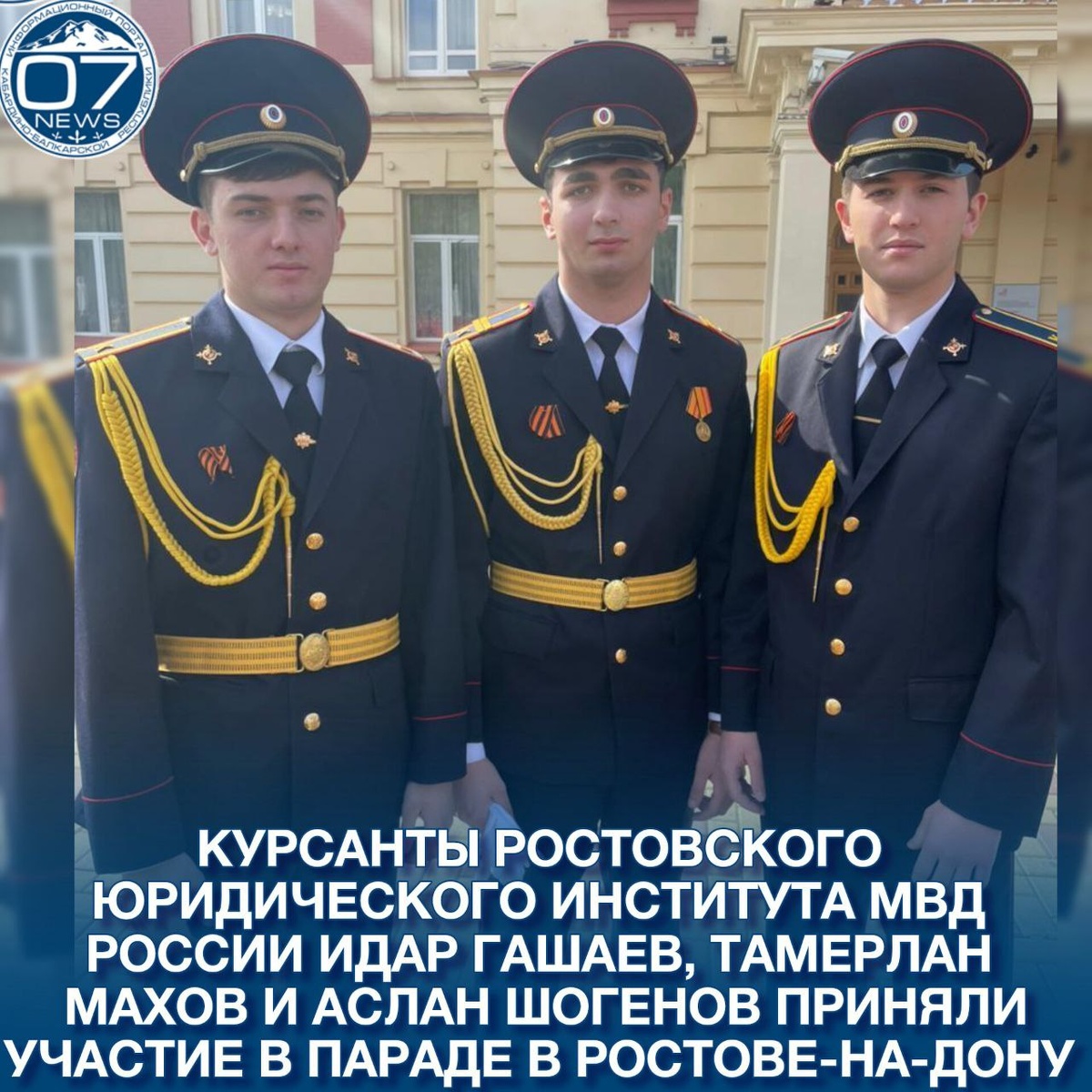 Наши земляки, курсанты 2 курса Ростовского юридического института МВД России, младший сержант Идар Гашаев (в центре), Тамерлан Махов и Аслан Шогенов приняли участие в параде Победы в Ростове-на-Дону. Гордимся!