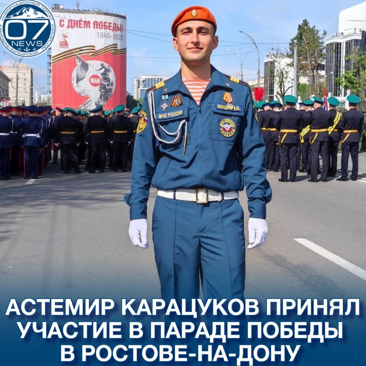Наш земляк, Карацуков Астемир Юрьевич из с. Кишпек Баксанского района участник парада в г. Ростов-на-дону. Астемир входит в личный состав Донского спасательного центра МЧС России. Многократно участвовал в гуманитарных спасательных операциях в территории ДНР и Запорожья. Участвовал в ликвидации экологической катастрофы в Анапе. Награждён почётными грамотами за заслуги в обеспечении защиты населения от ЧС природного и техногенного характера.
