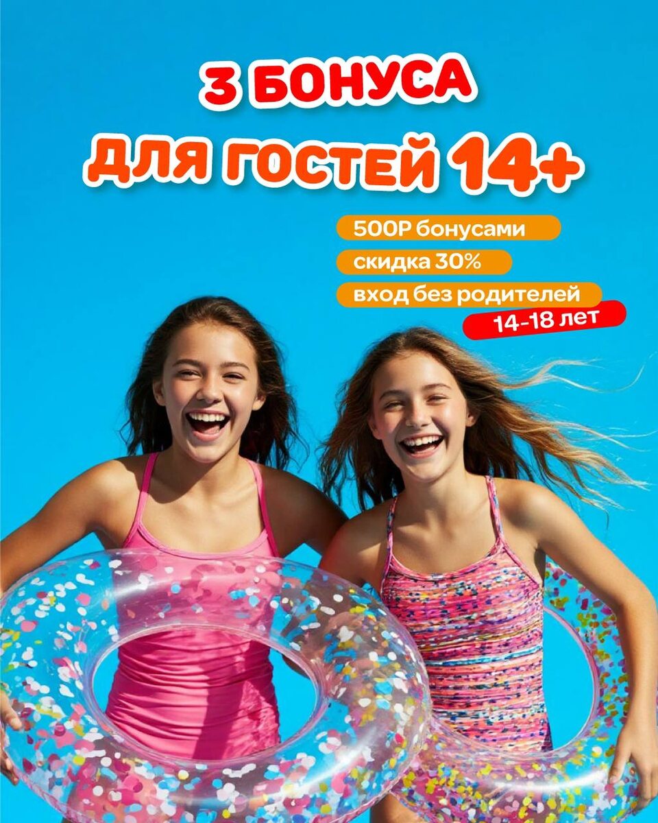 Добавьте в заключительные недели учебного года немного (или оооочень много) драйва🎢 Собирайте друзей, ловите скидку и заряжайтесь энергией для познания мира в аквапарке «Улёт»! 😉 У нас есть специальные предложения для юных гостей 14+!🙌 ⠀ 🌴500 бонусных рублей при регистрации в программе лояльности и подписке на любой удобный чат бот: 🔵Телеграм 🔵ВК Бонусы начислятся, если тебе от 14 до 18 лет включительно. ⠀ В аквапарке можно оплатить бонусами 25% от суммы чека по выгодному курсу 1 бонус = 1 рубль. ⠀ 🌴Скидка 30% по Пушкинской карте! Посещайте аквапарк по будням и получайте скидку 30% при предъявлении Пушкинской карты! Скидка действует на тарифы: 5+ часов и Безлимитный. Насладитесь водными аттракционами с выгодой. ⠀ 🌴Вход для подростков от 14 лет без родителей! Подросткам от 14 лет можно посещать аквапарк без сопровождения взрослых при наличии письменного согласия от родителей. ⠀ Для этого просто возьмите с собой паспорт и заполните специальное согласие на посещение аквапарка «Ул