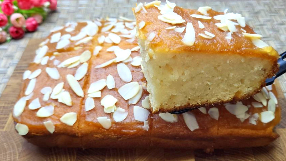 7. Горячий пирог сверху смазываю яблочным джемом и посыпаю миндальными лепестками. Можно, так же, смазать пирог любым вареньем и посыпать любыми орешками.