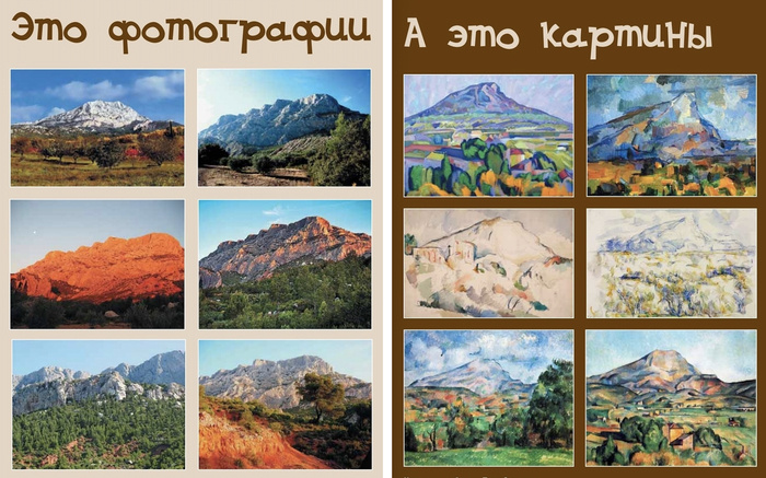 Cколько знаменитых гор есть на свете? Эверест, Эльбрус, Фудзияма, Килиманджаро, Монблан, Арарат, Верблюдка… А вот гора Сент-Виктуар на юге Франции особо знаменита среди художников. Сто пятьдесят лет назад французский художник Поль Сезанн создал несколько десятков картин и набросков с видами этой горы. Считается, что именно эти картины стали причиной возникновения такого необычного и знаменитого направления в искусстве 20-го века, как кубизм. Почему он изображал её именно так? «Не умел рисовать»? Сезанн рисовать умел. Посмотрите на его карандашные наброски портретов. А гору Сент-Виктуар он рисовал такой необычной специально – чтобы дать нам увидеть то, что видит глаз художника! Художник видит гораздо больше оттенков цвета, чем другие люди. Сезанн усилил каждый оттенок, чтобы мы тоже его увидели. И каждому усиленному цвету «подарил» на картине отдельное место – плоскость. Вот бриллиант. Почему он красивый? Потому что сияет, искрится. А почему он искрится? Потому что состоит из множества