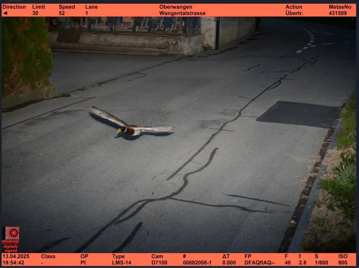 В швейцарской коммуне Кениц дорожная камера зафиксировала утку, превышающую скорость. Это не первый подобный случай в районе. В швейцарской коммуне Кениц дорожная камера зафиксировала утку, превышающую скорость. Это не первый подобный случай в районе, пишет Berner Zeitung. Снимок с уткой-нарушительницей опубликовали местные власти. Птица летела со скоростью 52 км/ч в зоне, где разрешено движение не быстрее 30 км/ч. Чиновники также заявили, что утка, возможно, является рецидивисткой, так как похожая птица уже попадала в объектив этой камеры в этот же день семь лет назад. Причем летела пернатая с той же скоростью. Местные жители приняли фотографию за фейк и подумали, что сообщение властей — это запоздалая первоапрельская шутка. Но в полиции заверили, что манипулировать снимками в радарной системе невозможно, а все камеры ежегодно проверяются швейцарским институтом метрологии.