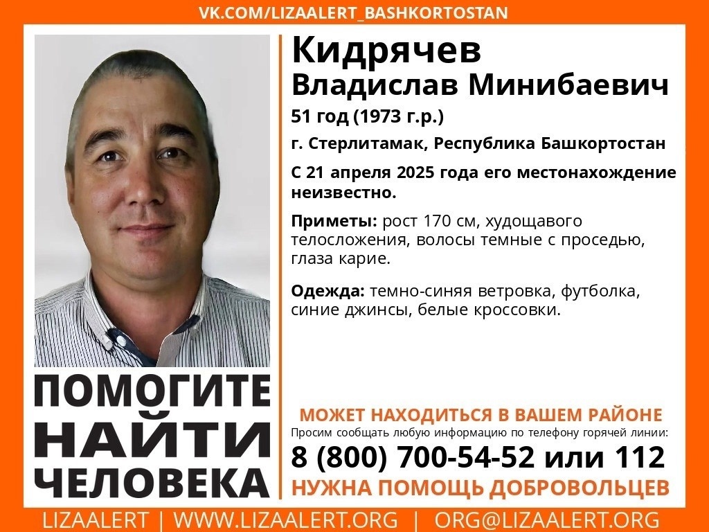 51-летний Владислав Кидрячев из Стерлитамака пропал без вести в Башкирии 21 апреля. По данным волонтеров «Лизы Алерт РБ», мужчина был одет в темно-синюю ветровку, футболку, синие джинсы и белые кроссовки. Другие приметы исчезнувшего – рост 170 см, худощавое телосложение, темные волосы с проседью, карие глаза. Всех, кто располагает какой-либо информацией, просят сообщить по телефонам 8-800-700-54-52 или 112. Ранее в республике завершились поиски девушки.