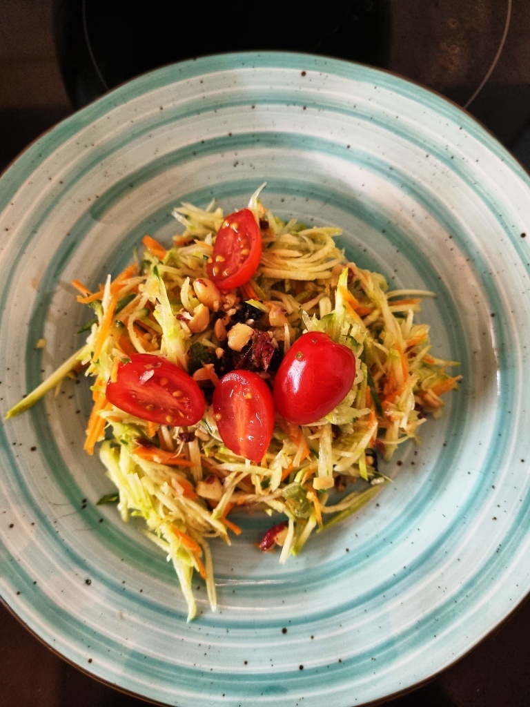 Я добавила и то и то. Ну что сказать? Вкус – очень похож, немного нежнее, чем с зеленой папайей, которую мы сноровисто шинковали на тайской кухне специальной теркой. Да, салат из кабачка и огурца очень похож на оригинал, похрустывает также очаровательно и имеет четыре вкуса – сладкий, острый, кислый и соленый.