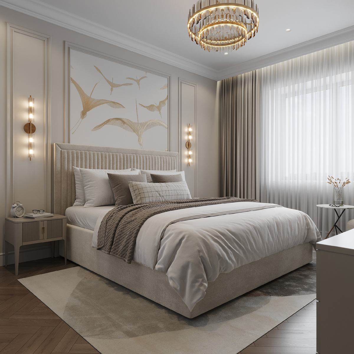 Классические формы никогда не выходят из моды, но в 2025 году они обретают новое дыхание. Стиль Неоклассика в спальне — это симметрия, изящные лепные элементы, высокие потолки, но без излишеств. Цветовая палитра — благородная и сдержанная: серо-бежевые тона, оттенки молочного, жемчужного, с акцентами в бронзе или золоте.