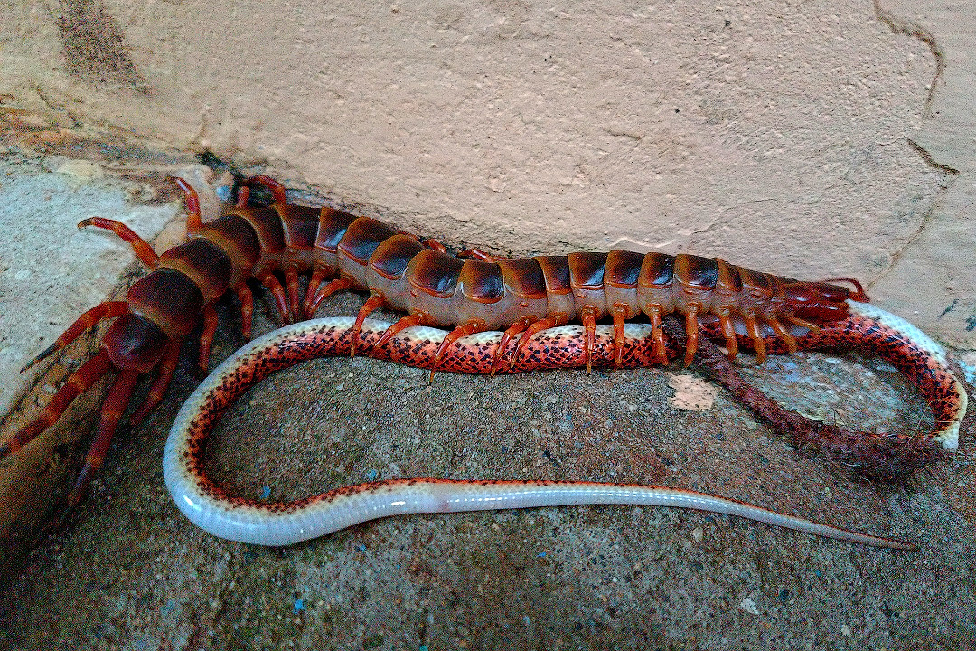 Привет, мои дорогие любители необычной земной фауны. Сегодня у нас интересный гость, о котором давно стоило написать, но всё как-то руки не доходили, тем более, что руками я Пишу это заметку с некоторым внутренним содроганием, ибо многоножки являются теми редкими существами, которые вызывают у меня ощущение непроходящей неприязни (наравне с тараканами и глупцами). Я бы сказал "прошу любить и жаловать", однако с моей стороны это было бы не честно, ибо сам я их не люблю и не жалую, поэтому просто знакомьтесь, наш сегодняшний герой – гигантская сколопендра (Scolopendra gigantea). Обитает этот вид (к счастью) в северо-восточной части Южной Америки, включая несколько ближних островов. Как и многие её сородичи, она предпочитает тёмные и влажные места, где отдыхает днём, а ночью покидает укрытие, выходя на охоту. Как вы видите на фото её добычей могут быть не только мелкие беспозвоночные, но и рептилии, амфибии, птицы и млекопитающие, сопоставимые с ней по массе. Летучих мышей гигантская ск