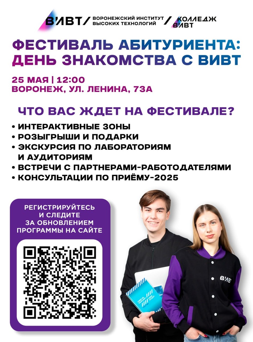 Фестиваль абитуриента ВИВТ — это отличная возможность узнать всё о поступлении в 2025 году! Вас ждут консультации специалистов приёмной комиссии, экскурсии по лабораториям и аудиториям, встречи с партнёрами-работодателями, а также подарки и призы. Когда: 25 мая в 12:00. Где: ВИВТ, ул. Ленина, 73А Не упустите шанс получить полезную информацию и зарядиться позитивной атмосферой! Регистрируйтесь по ссылке, чтобы быть в курсе всех событий.